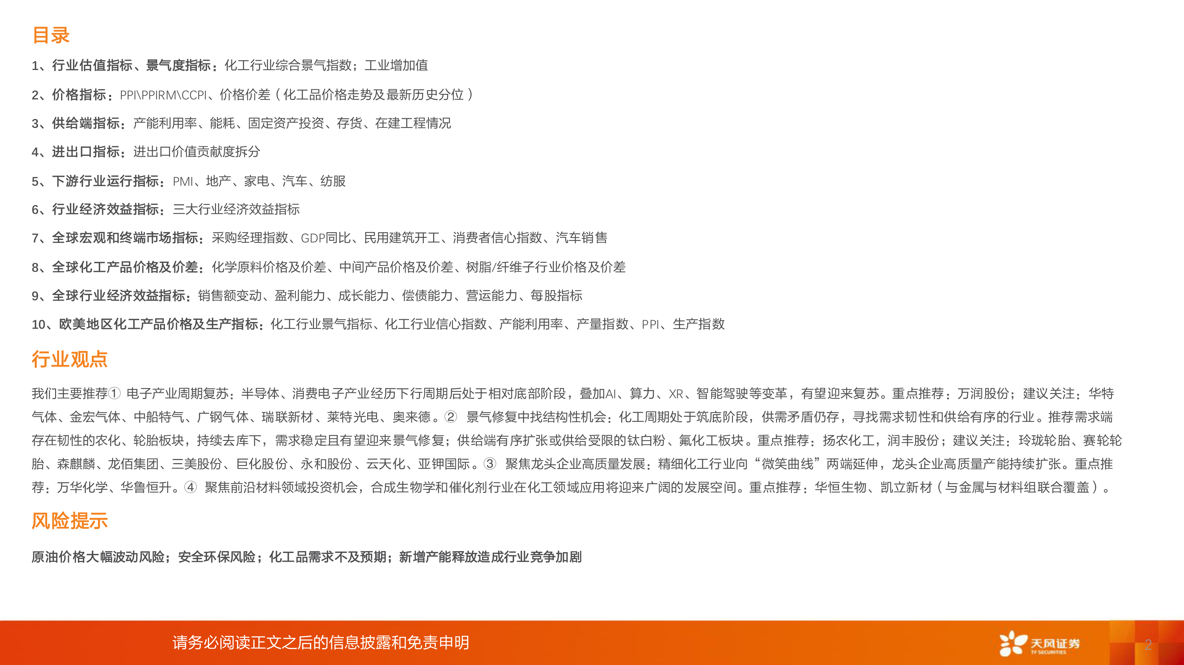 报告分析了PMI、房地产、家电、汽车和纺服等下游行业的运行指标,以评估下游需求对化工行业的影响。