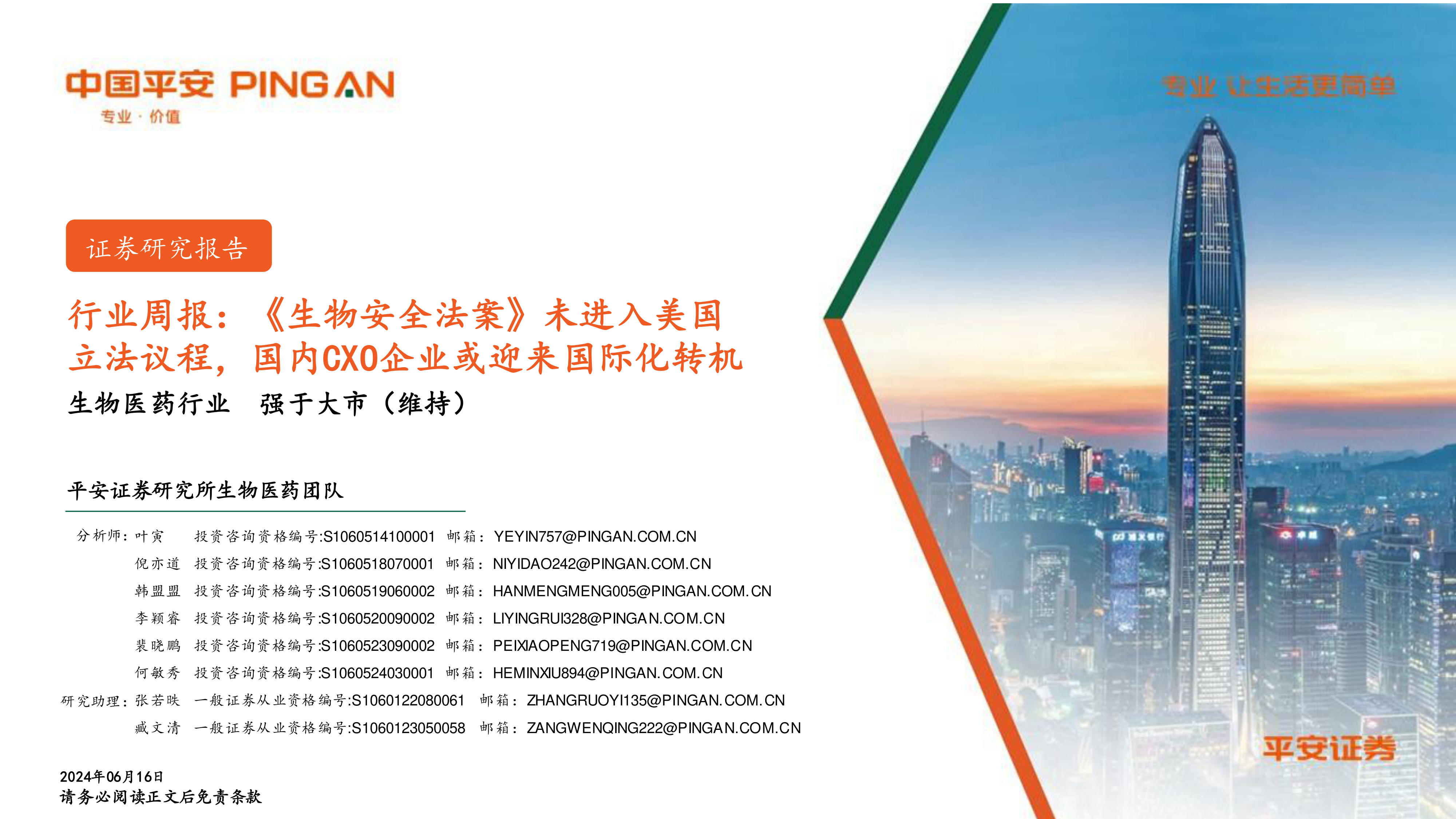 本报告基于对美国《生物安全法案》、ADC药物市场、健友股份以及行业政策和市场表现的分析,得出中国生物医药行业强于大市的结论。美国法案的搁浅为中国CXO企业提供了国际化发展的机遇,但企业仍需持续提升自身竞争力。报告推荐了一系列值得关注的投资标的,但投资者需谨慎评估风险,并进行独立判断。 报告中提供的业绩预测和投资建议仅供参考,不构成投资建议。