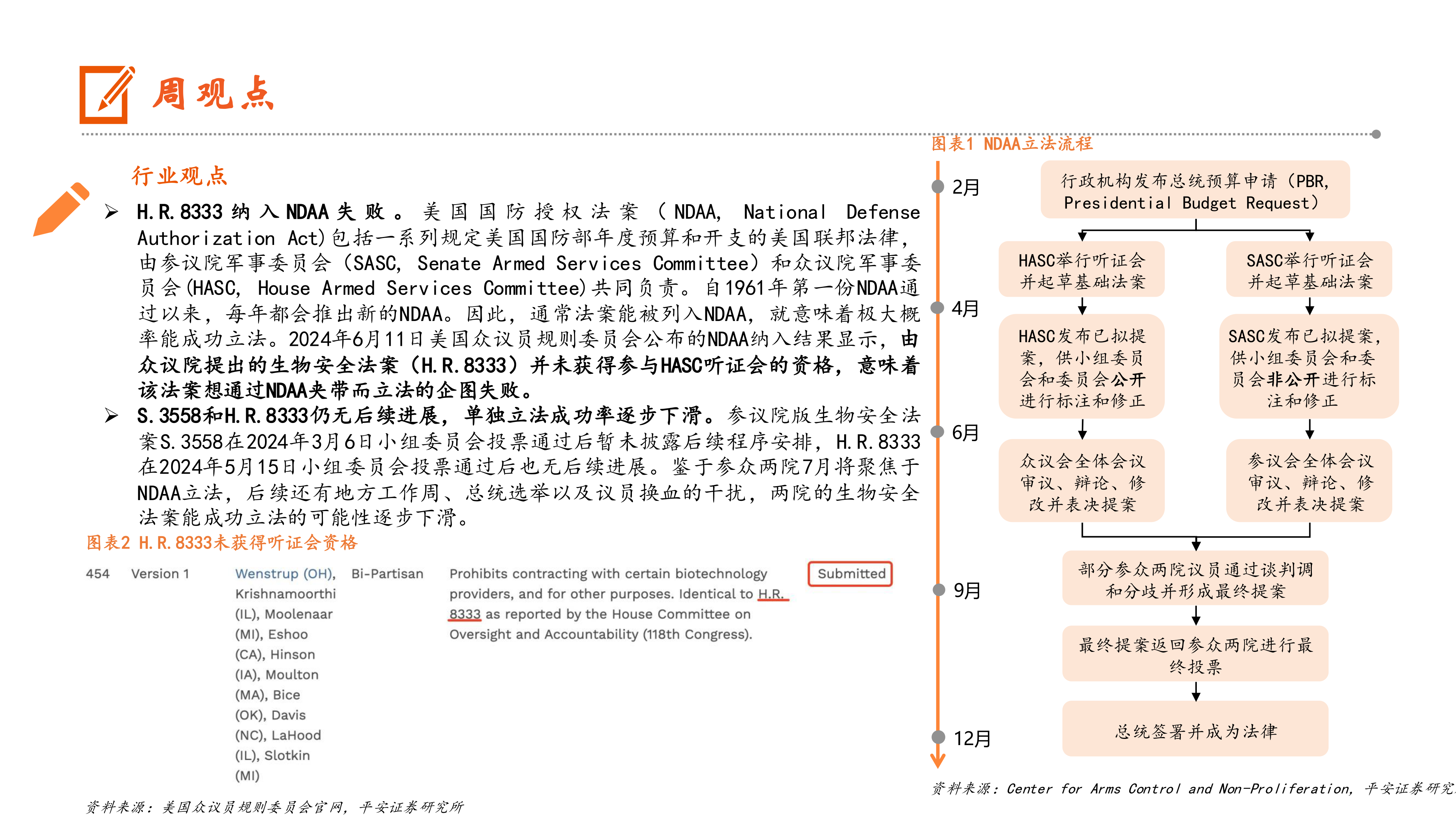 H.R.8333纳入NDAA失败。美国国防授权法案(NDAA,National DefenseAuthorizationAct)包括一系列规定美国国防部年度预算和开支的美国联邦法律,由参议院军事委员会(SASC,Senate Armed Services Committee)和众议院军事委员会(HASC,House Armed Services Committee)共同负责。自1961年第一份NDAA通过以来,每年都会推出新的NDAA。因此,通常法案能被列入NDAA,就意味着极大概率能成功立法。2024年6月11日美国众议员规则委员会公布的NDAA纳入结果显示,由众议院提出的生物安全法案(H.R.8333)并未获得参与HASC听证会的资格,意味着该法案想通过NDAA夹带而立法的企图失败。