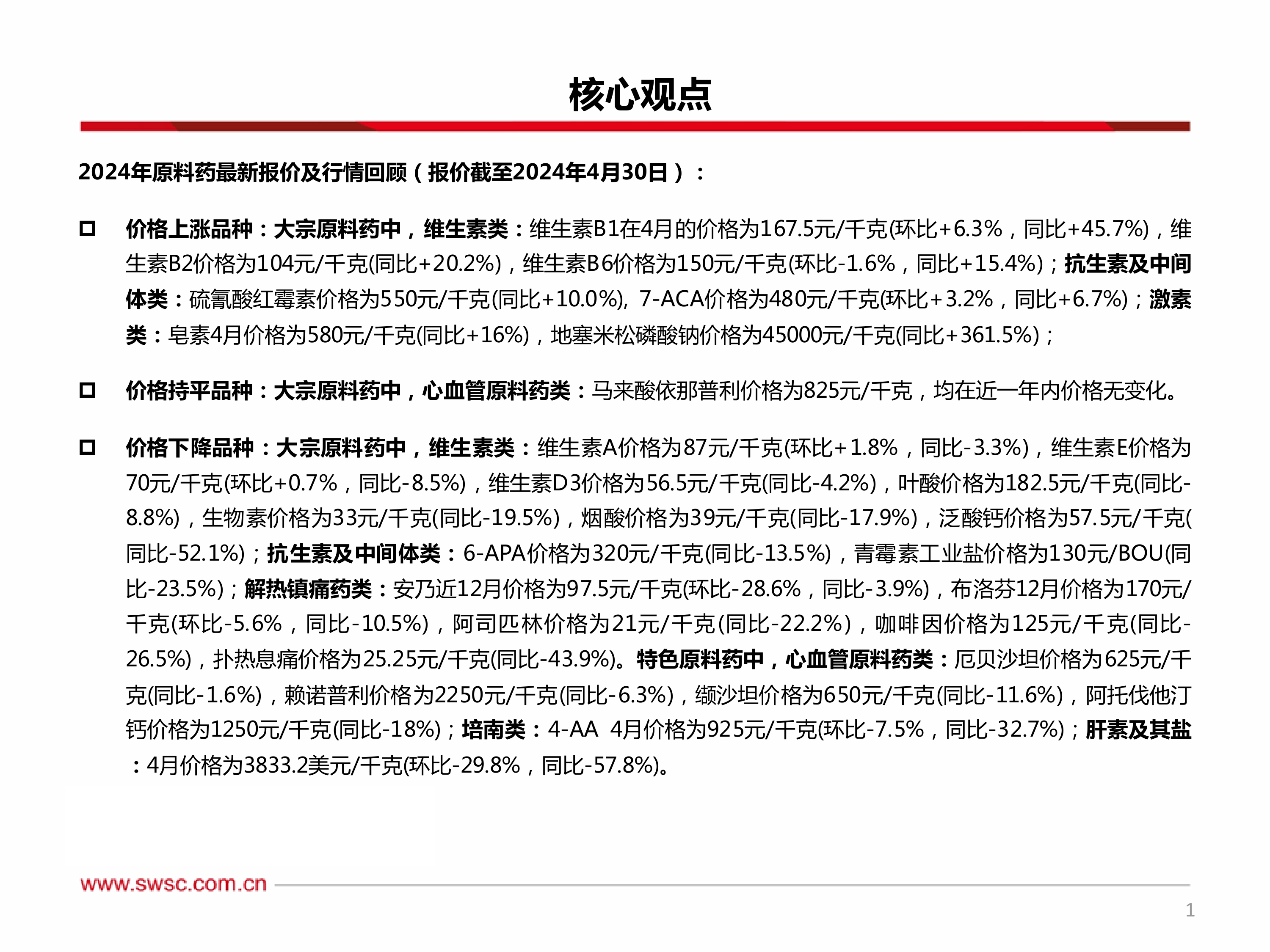 本报告以2024年第一季度原料药市场行情为基础,对维生素、抗生素、解热镇痛药、激素类药、心血管原料药、培南类和肝素等多个类别原料药的价格波动进行了详细分析。报告内容涵盖了以下几个方面: