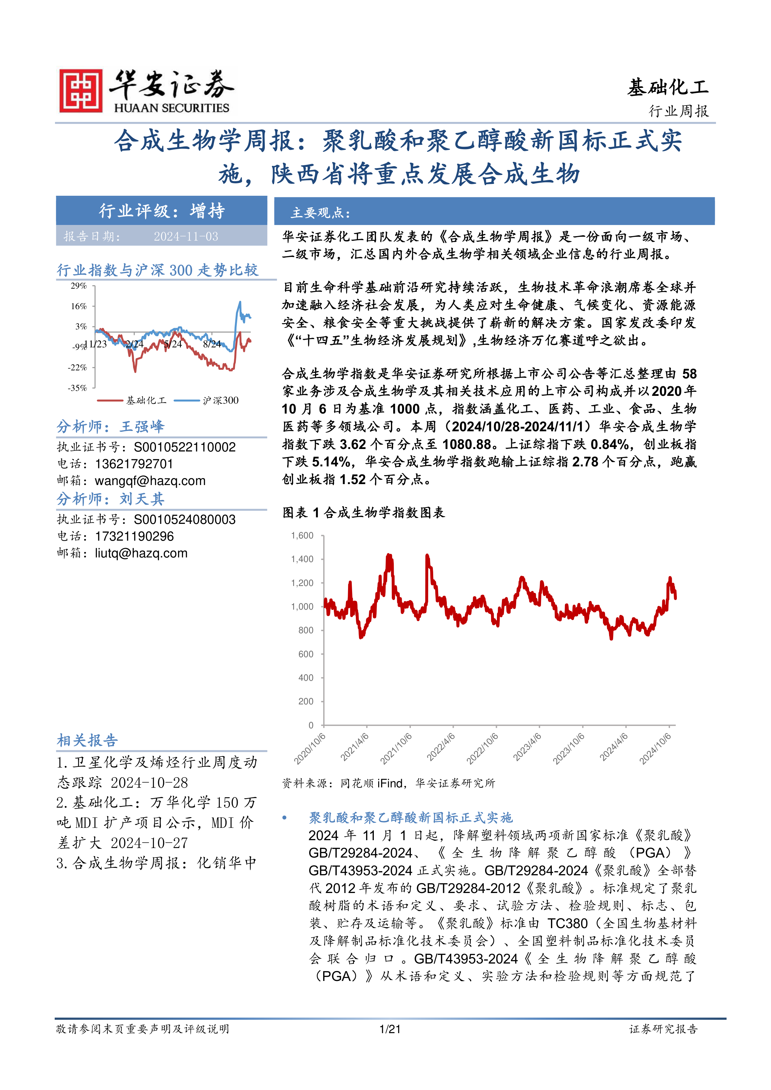 2024年11月1日起,降解塑料领域两项新国家标准《聚乳酸》GB/T29284-2024、《全生物降解聚乙醇酸(PGA)》GB/T43953-2024正式实施。GB/T29284-2024《聚乳酸》全部替代2012年发布的GB/T29284-2012《聚乳酸》。标准规定了聚乳酸树脂的术语和定义、要求、试验方法、检验规则、标志、包装、贮存及运输等。《聚乳酸》标准由TC380(全国生物基材料及降解制品标准化技术委员会)、全国塑料制品标准化技术委员会联合归口。GB/T43953-2024《全生物降解聚乙醇酸(PGA)》从术语和定义、实验方法和检验规则等方面规范了PGA树脂产品的密度、熔点、含水率、降解性能等以及包装、贮存等技术指标。《全生物降解聚乙醇酸(PGA)》标准由TC380(全国生物基材料及降解制品标准化技术委员会)归口。(资料来源:生物基能源与材料,华安证券研究所)