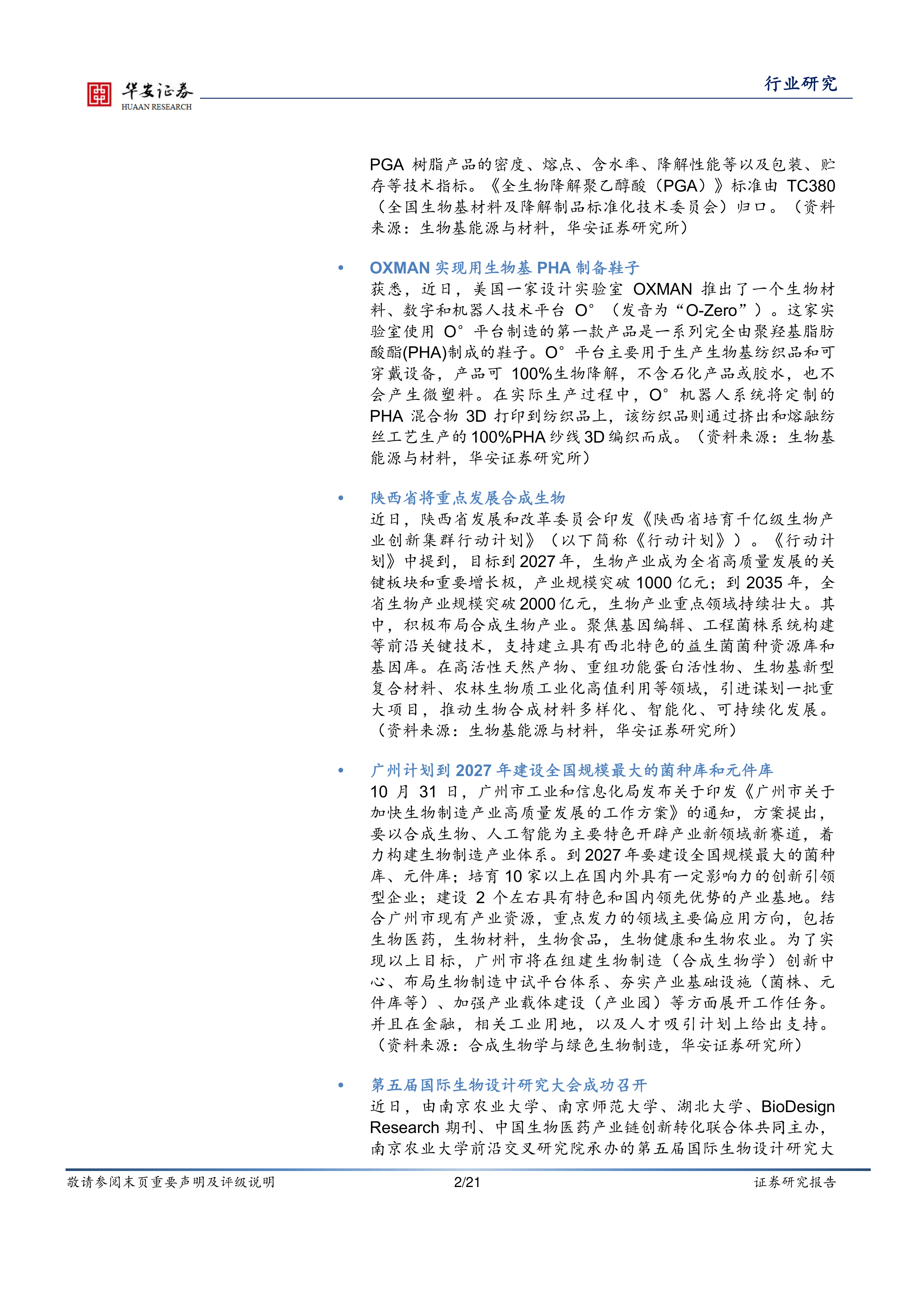 华安证券化工团队发表的《合成生物学周报》是一份面向一级市场、二级市场,汇总国内外合成生物学相关领域企业信息的行业周报。目前生命科学基础前沿研究持续活跃,生物技术革命浪潮席卷全球并加速融入经济社会发展,为人类应对生命健康、气候变化、资源能源安全、粮食安全等重大挑战提供了崭新的解决方案。国家发改委印发《“十四五”生物经济发展规划》,生物经济万亿赛道呼之欲出。