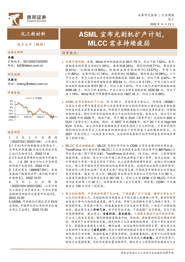 化工新材料行业周报:ASML宣布光刻机扩产计划,MLCC需求持续疲弱