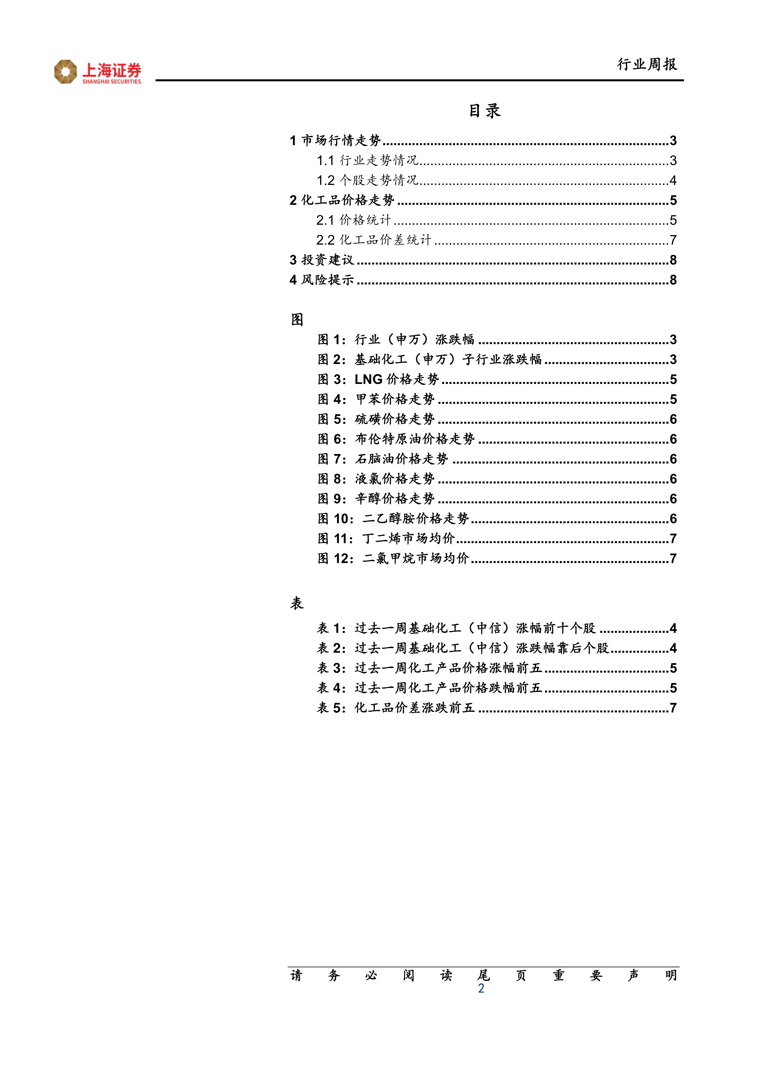 本周化工产品价格涨幅前五名分别为:NYMEX天然气(10.05%)、国际甲苯(7.31%)、硫磺(6.20%)、布伦特原油(5.81%)和国际石脑油(5.73%)。 跌幅前五名分别为:液氯(-7.27%)、辛醇(-7.00%)、二乙醇胺(-5.44%)、丁二烯(-3.92%)和二氯甲烷(-3.75%)。 报告提供了详细的表格和图表,展示了这些产品的价格走势以及年初至今的涨跌幅。