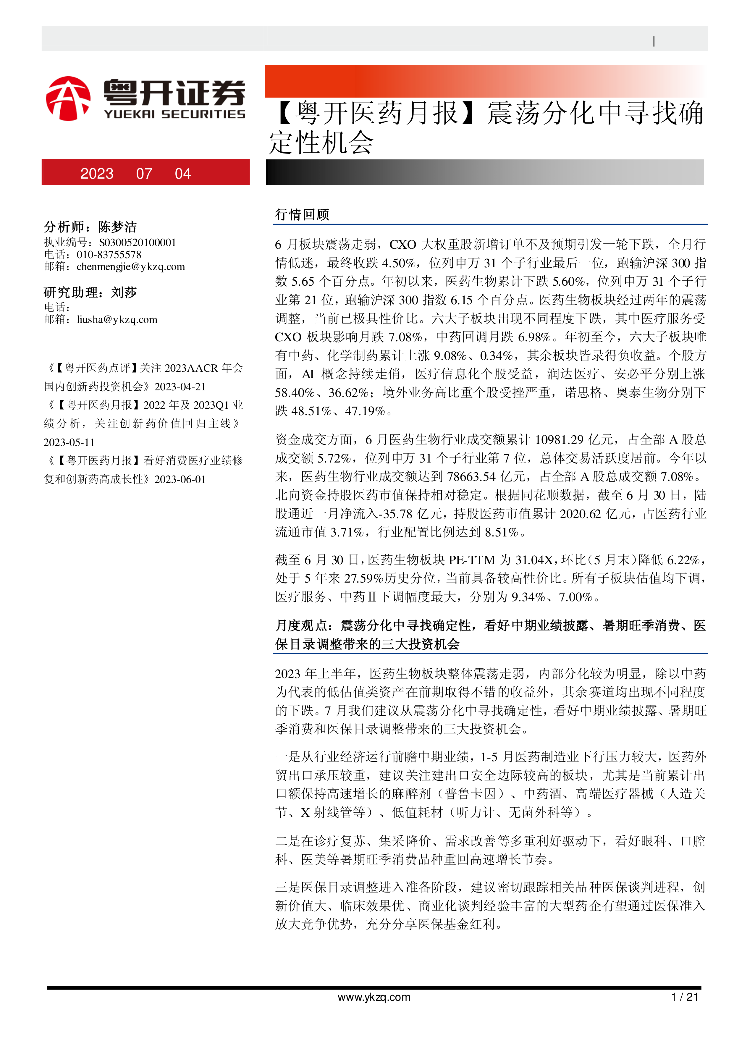 本报告的核心观点是:2023年6月医药生物板块震荡走弱,但从中长期来看,具备较高性价比,存在确定性投资机会。报告建议关注三大投资机会:中期业绩披露、暑期旺季消费和医保目录调整。