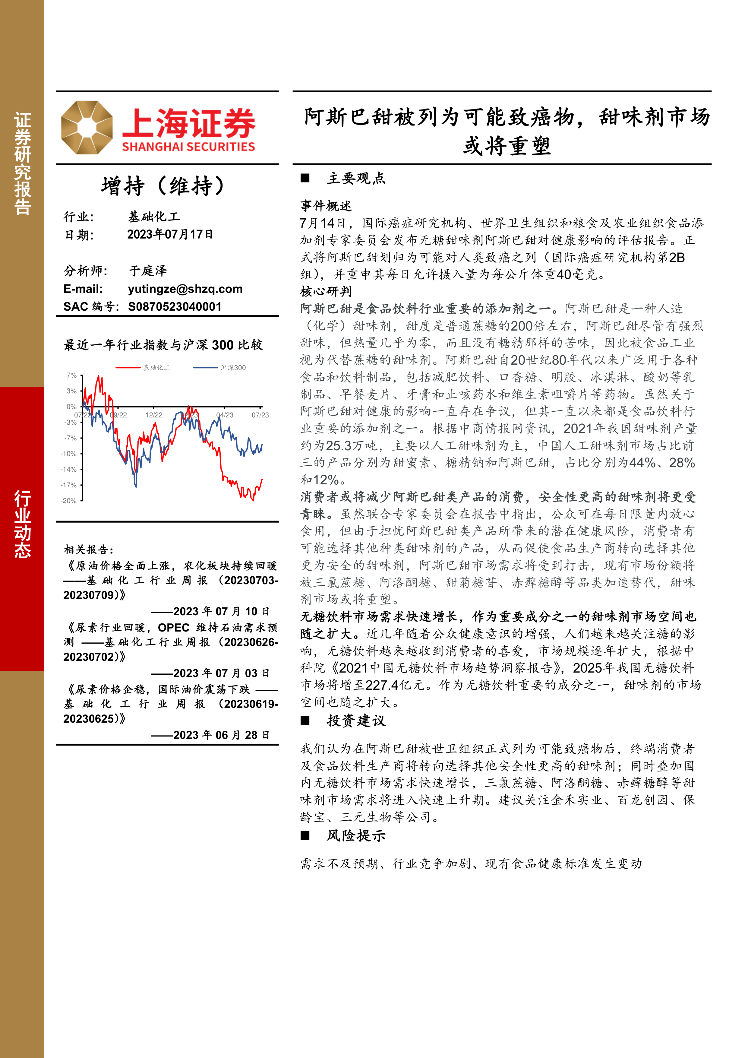 报告还简要提及了近期基础化工行业周报,内容涉及原油价格、尿素行业等,这些信息为理解宏观经济环境对甜味剂行业的影响提供了背景信息。