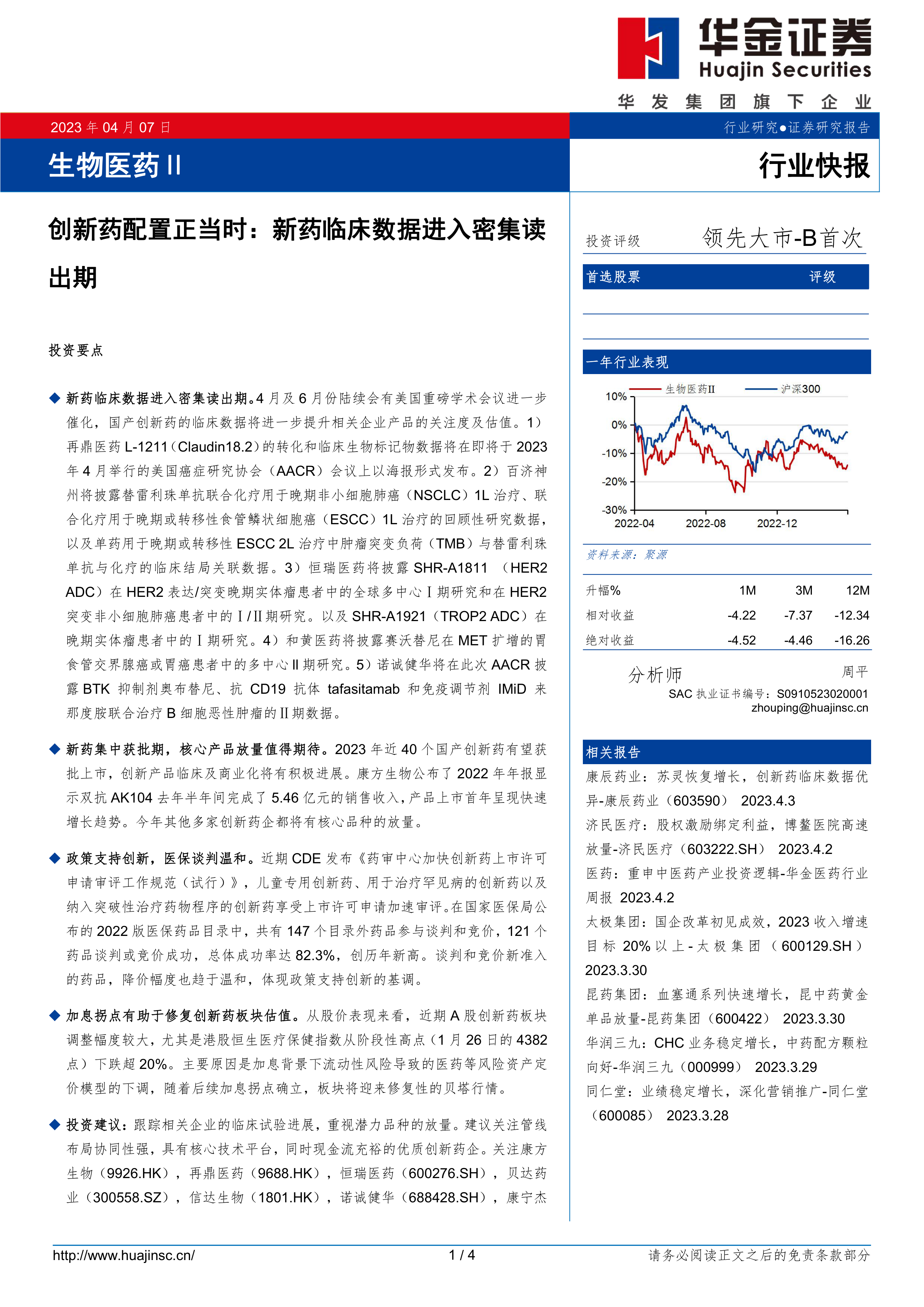 新药临床数据进入密集读出期。4月及6月份陆续会有美国重磅学术会议进一步催化,国产创新药的临床数据将进一步提升相关企业产品的关注度及估值。1)再鼎医药L-1211(Claudin18.2)的转化和临床生物标记物数据将在即将于2023年4月举行的美国癌症研究协会(AACR)会议上以海报形式发布。2)百济神州将披露替雷利珠单抗联合化疗用于晚期非小细胞肺癌(NSCLC)1L治疗、联合化疗用于晚期或转移性食管鳞状细胞癌(ESCC)1L治疗的回顾性研究数据,以及单药用于晚期或转移性ESCC2L治疗中肿瘤突变负荷(TMB)与替雷利珠单抗与化疗的临床结局关联数据。3)恒瑞医药将披露SHR-A1811(HER2ADC)在HER2表达/突变晚期实体瘤患者中的全球多中心Ⅰ期研究和在HER2突变非小细胞肺癌患者中的Ⅰ/Ⅱ期研究。以及SHR-A1921(TROP2ADC)在晚期实体瘤患者中的Ⅰ期研究。4)和黄医药将披露赛沃替尼在MET扩增的胃食管交界腺癌或胃癌患者中的多中心ll期研究。5)诺诚健华将在此次AACR披露BTK抑制剂奥布替尼、抗CD19抗体tafasitamab和免疫调节剂IMiD来那度胺联合治疗B细胞恶性肿瘤的Ⅱ期数据。