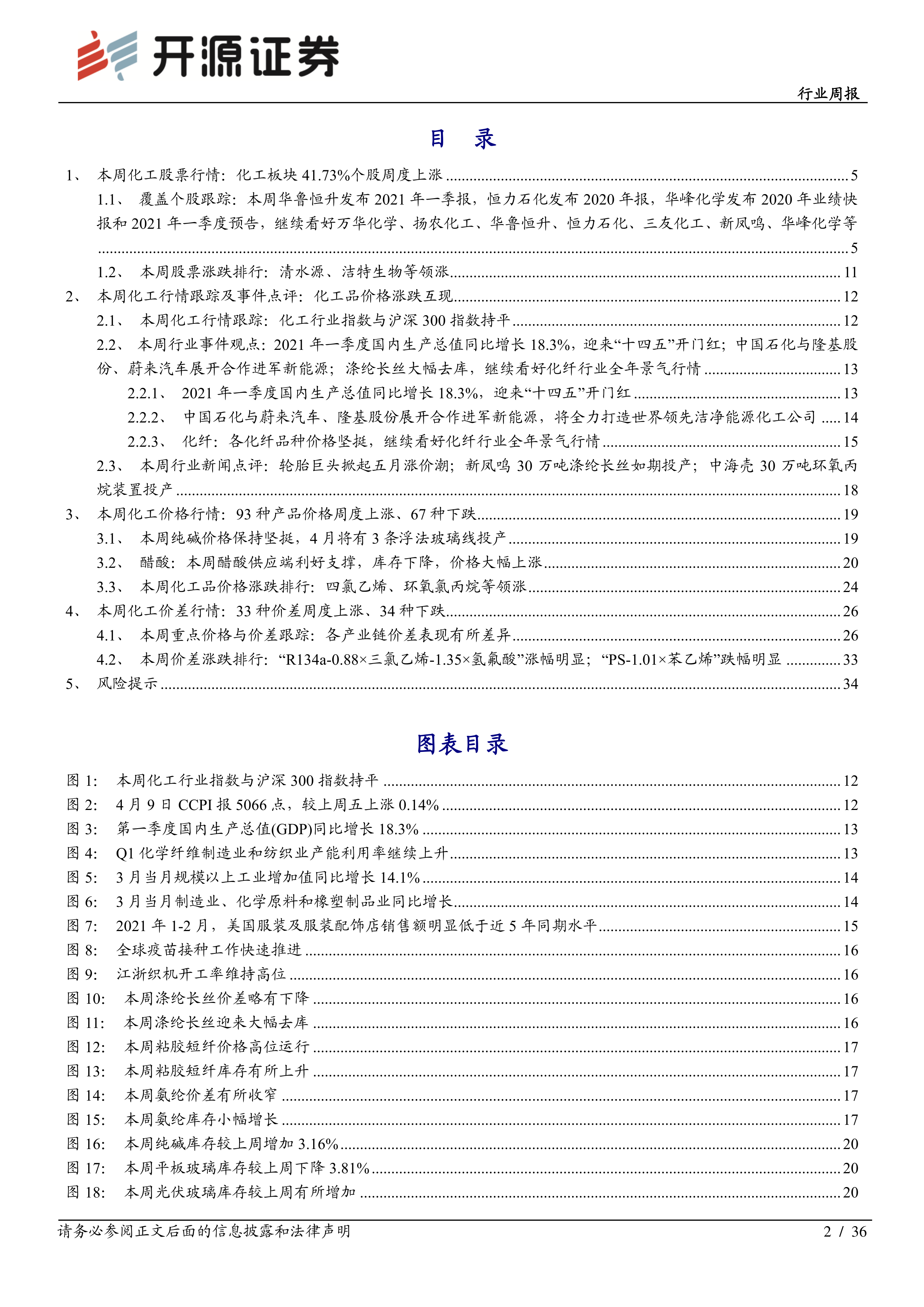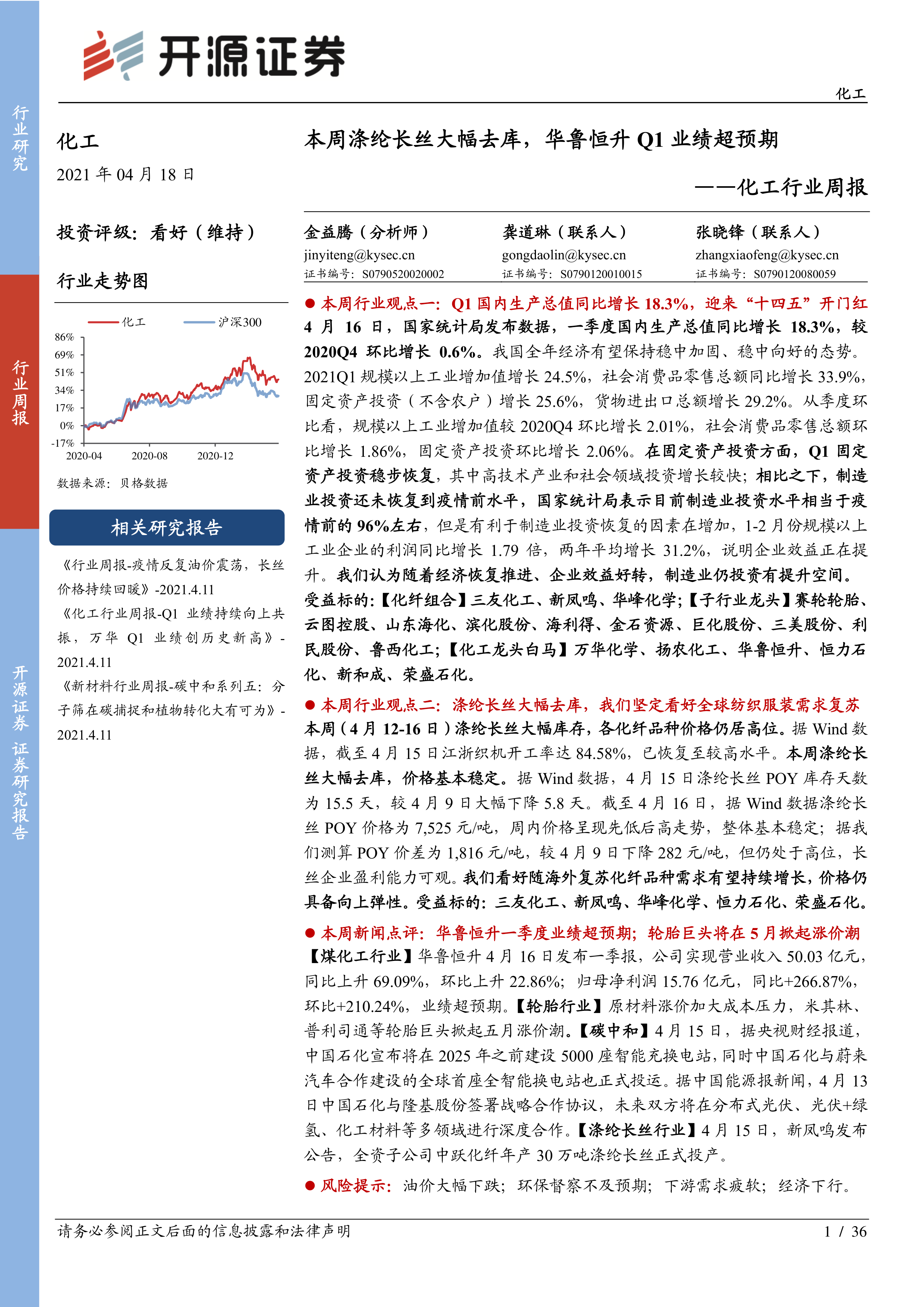 本周行业观点一:Q1 国内生产总值同比增长 18.3%,迎来“十四五”开门红4 月 16 日,国家统计局发布数据,一季度国内生产总值同比增长 18.3%,较2020Q4 环比增长 0.6%。我国全年经济有望保持稳中加固、稳中向好的态势。2021Q1 规模以上工业增加值增长 24.5%,社会消费品零售总额同比增长 33.9%,固定资产投资(不含农户)增长 25.6%,货物进出口总额增长 29.2%。从季度环比看,规模以上工业增加值较 2020Q4 环比增长 2.01%,社会消费品零售总额环比增长 1.86%,固定资产投资环比增长 2.06%。在固定资产投资方面,Q1 固定资产投资稳步恢复, 其中高技术产业和社会领域投资增长较快; 相比之下,制造业投资还未恢复到疫情前水平,国家统计局表示目前制造业投资水平相当于疫情前的 96%左右,但是有利于制造业投资恢复的因素在增加, 1-2 月份规模以上工业企业的利润同比增长 1.79 倍,两年平均增长 31.2%,说明企业效益正在提升。我们认为随着经济恢复推进、企业效益好转,制造业仍投资有提升空间。受益标的:【化纤组合】三友化工、新凤鸣、 华峰化学;【子行业龙头】 赛轮轮胎、云图控股、山东海化、滨化股份、海利得、金石资源、巨化股份、三美股份、利民股份、鲁西化工;【化工龙头白马】万华化学、扬农化工、华鲁恒升、恒力石化、新和成、荣盛石化。