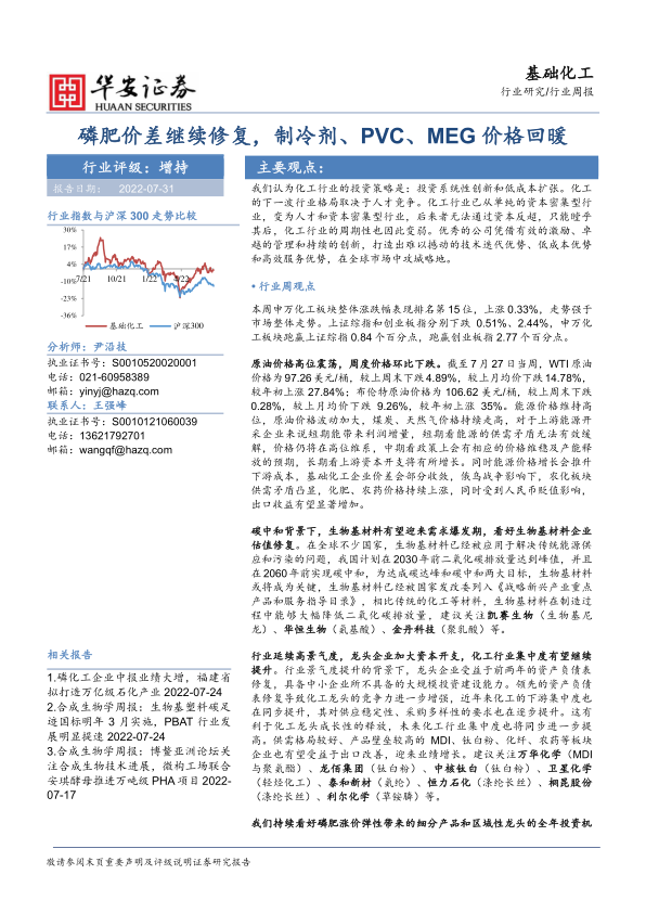 基础化工行业周报:磷肥价差继续修复,制冷剂、PVC、MEG价格回暖