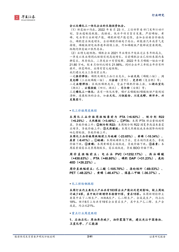 报告对化工产品价格和价差进行了周度跟踪,分析了 PTA、制冷剂 R22、天然橡胶等价格上涨的原因,以及硫磺、黄磷、尿素等价格下跌的原因。 同时,报告也分析了电石法 PVC、热法磷酸等价差上涨的原因,以及己二酸、涤纶短纤等价差下跌的原因,为投资者提供价格波动趋势的参考。