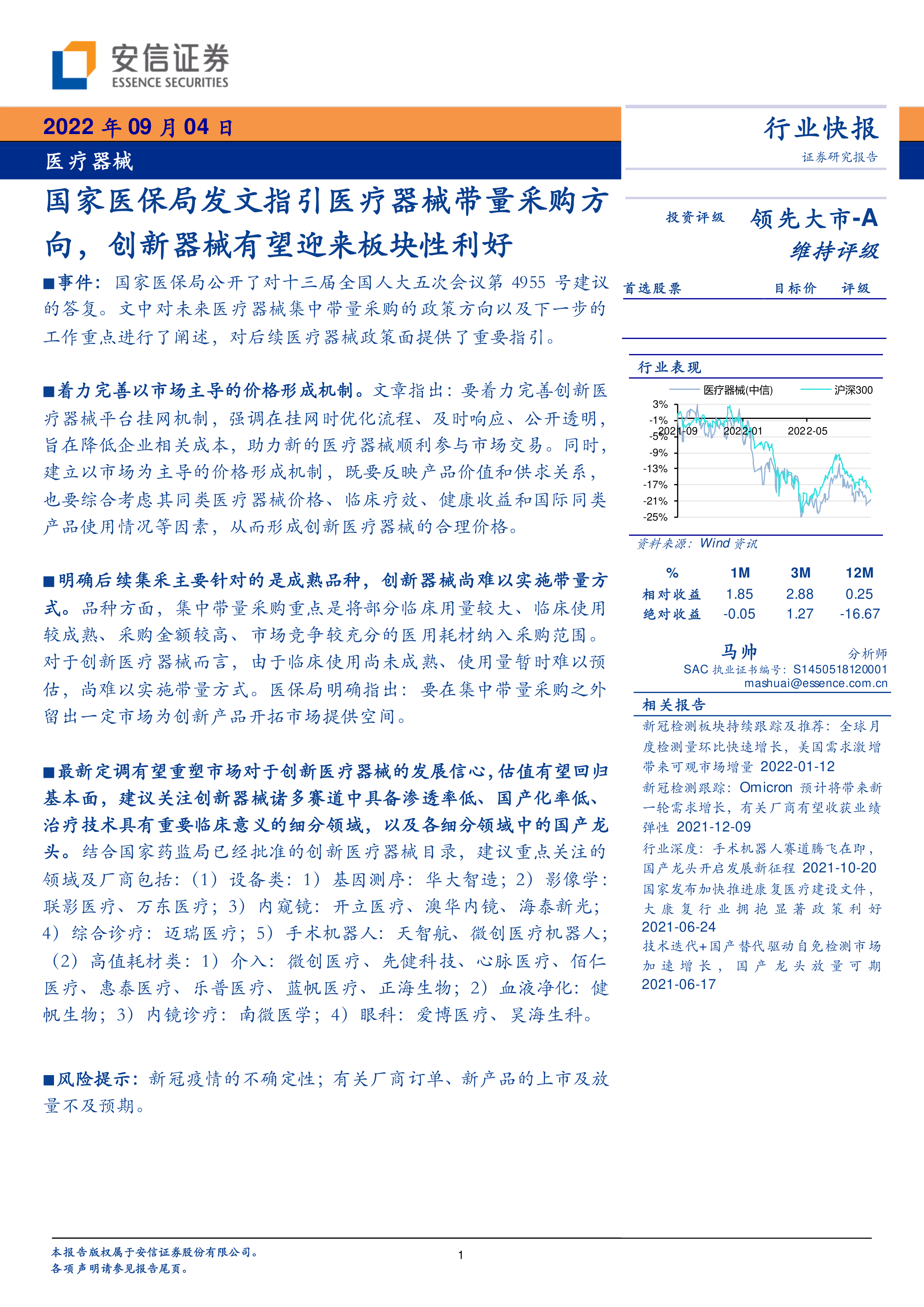 报告首先分析了医疗器械行业的近期表现,并结合国家医保局对十三届全国人大五次会议第 4955 号建议的答复,详细解读了未来医疗器械集中带量采购的政策方向和工作重点。 答复中强调要完善创新医疗器械平台挂网机制,降低企业成本,并建立以市场为主导的价格形成机制,综合考虑产品价值、供求关系、临床疗效、健康收益和国际同类产品使用情况等因素,形成创新医疗器械的合理价格。 同时,明确指出集采将主要针对成熟品种,创新器械将被排除在带量采购之外,从而为其发展创造空间。
