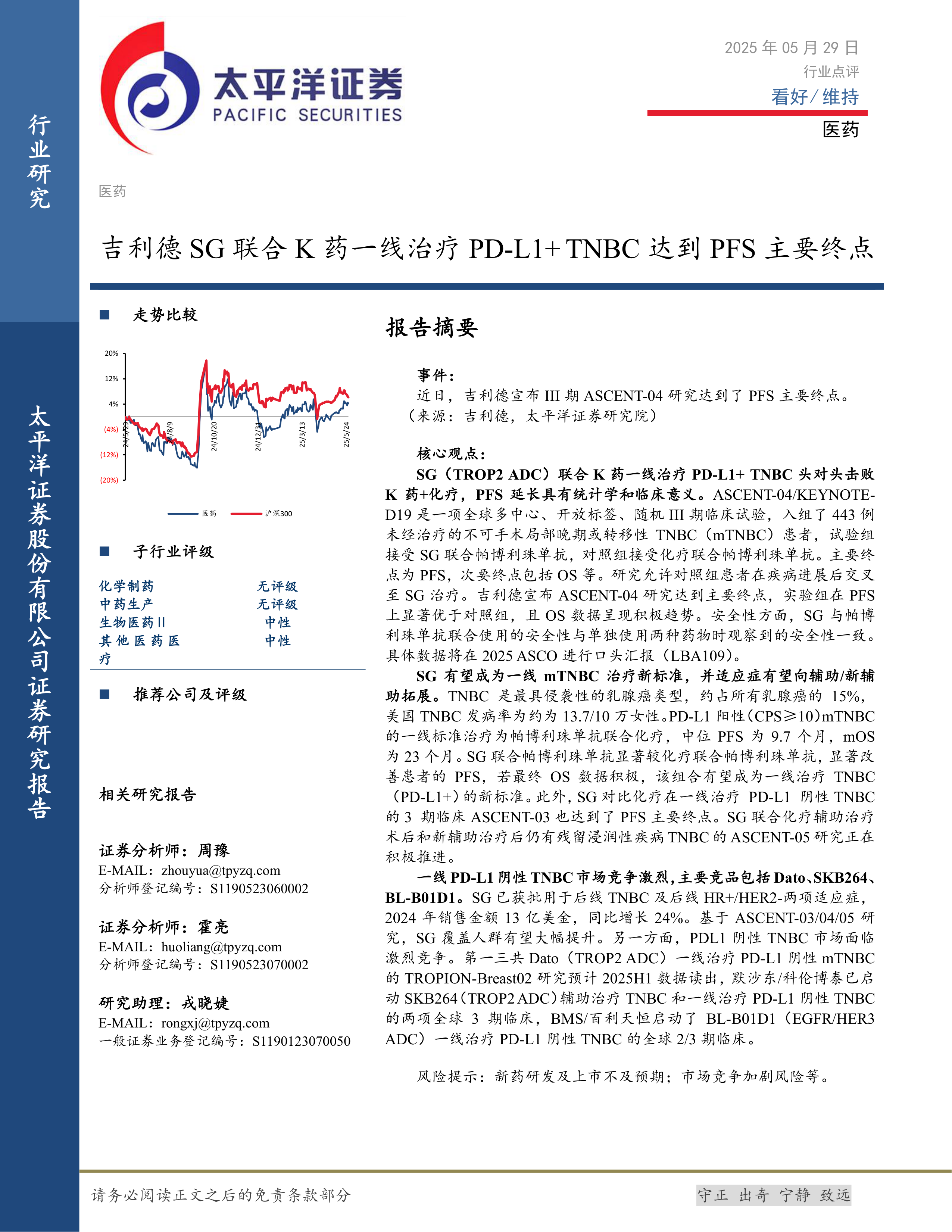 本报告的核心观点是吉利德科学公司(Gilead Sciences)的Trop-2抗体药物偶联物(ADC)药物SG联合帕博利珠单抗(K药)一线治疗PD-L1阳性三阴性乳腺癌(TNBC)取得显著疗效,PFS(无进展生存期)达到主要终点,有望成为一线治疗新标准。同时,报告也分析了SG在PD-L1阴性TNBC市场面临的激烈竞争。