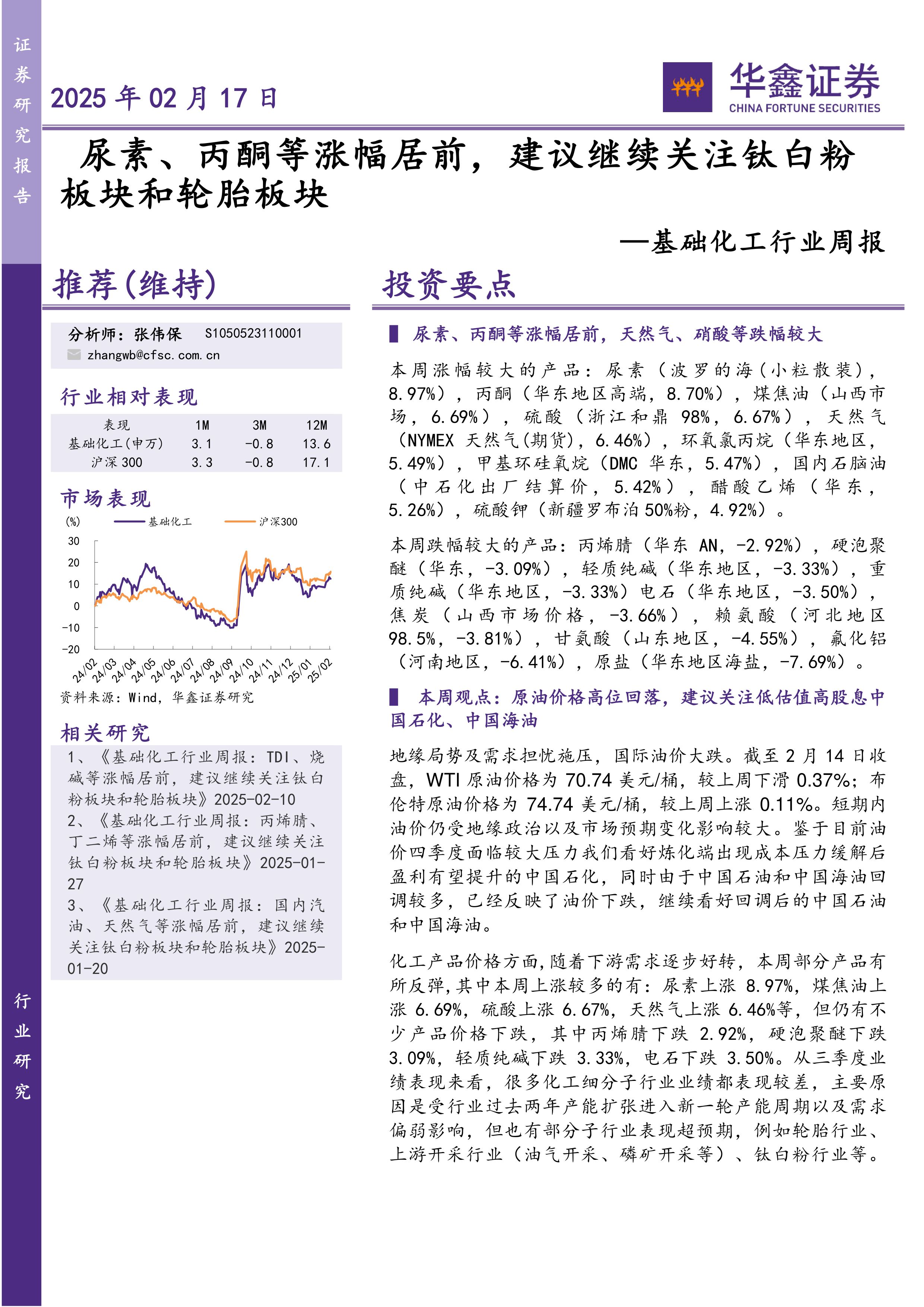 基础化工行业周报:尿素、丙酮等涨幅居前,建议继续关注钛白粉板块和轮胎板块
