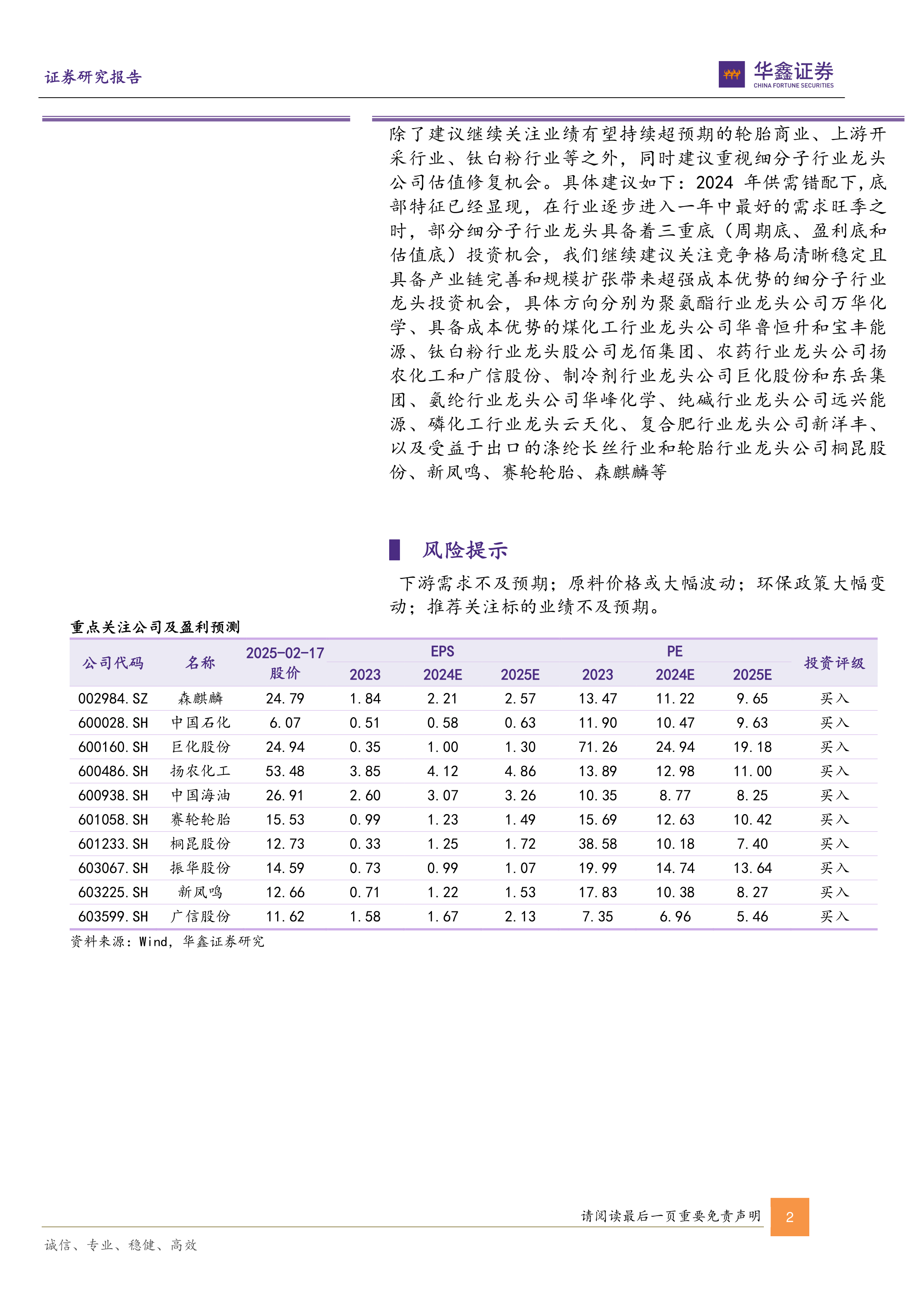 化工产品价格方面,随着下游需求逐步好转,本周部分产品有所反弹,其中本周上涨较多的有:尿素上涨8.97%,煤焦油上涨6.69%,硫酸上涨6.67%,天然气上涨6.46%等,但仍有不少产品价格下跌,其中丙烯腈下跌2.92%,硬泡聚醚下跌3.09%,轻质纯碱下跌3.33%,电石下跌3.50%。从三季度业绩表现来看,很多化工细分子行业业绩都表现较差,主要原因是受行业过去两年产能扩张进入新一轮产能周期以及需求偏弱影响,但也有部分子行业表现超预期,例如轮胎行业、上游开采行业(油气开采、磷矿开采等)、钛白粉行业等。除了建议继续关注业绩有望持续超预期的轮胎商业、上游开采行业、钛白粉行业等之外,同时建议重视细分子行业龙头公司估值修复机会。具体建议如下:2024年供需错配下,底部特征已经显现,在行业逐步进入一年中最好的需求旺季之时,部分细分子行业龙头具备着三重底(周期底、盈利底和估值底)投资机会,我们继续建议关注竞争格局清晰稳定且具备产业链完善和规模扩张带来超强成本优势的细分子行业龙头投资机会,具体方向分别为聚氨酯行业龙头公司万华化学、具备成本优势的煤化工行业龙头公司华鲁恒升和宝丰能源、钛白粉行业龙头股公司龙佰集团、农药行业龙头公司扬农化工和广信股份、制冷剂行业龙头公司巨化股份和东岳集团、氨纶行业龙头公司华峰化学、纯碱行业龙头公司远兴能源、磷化工行业龙头云天化、复合肥行业龙头公司新洋丰、以及受益于出口的涤纶长丝行业和轮胎行业龙头公司桐昆股份、新凤鸣、赛轮轮胎、森麒麟等
