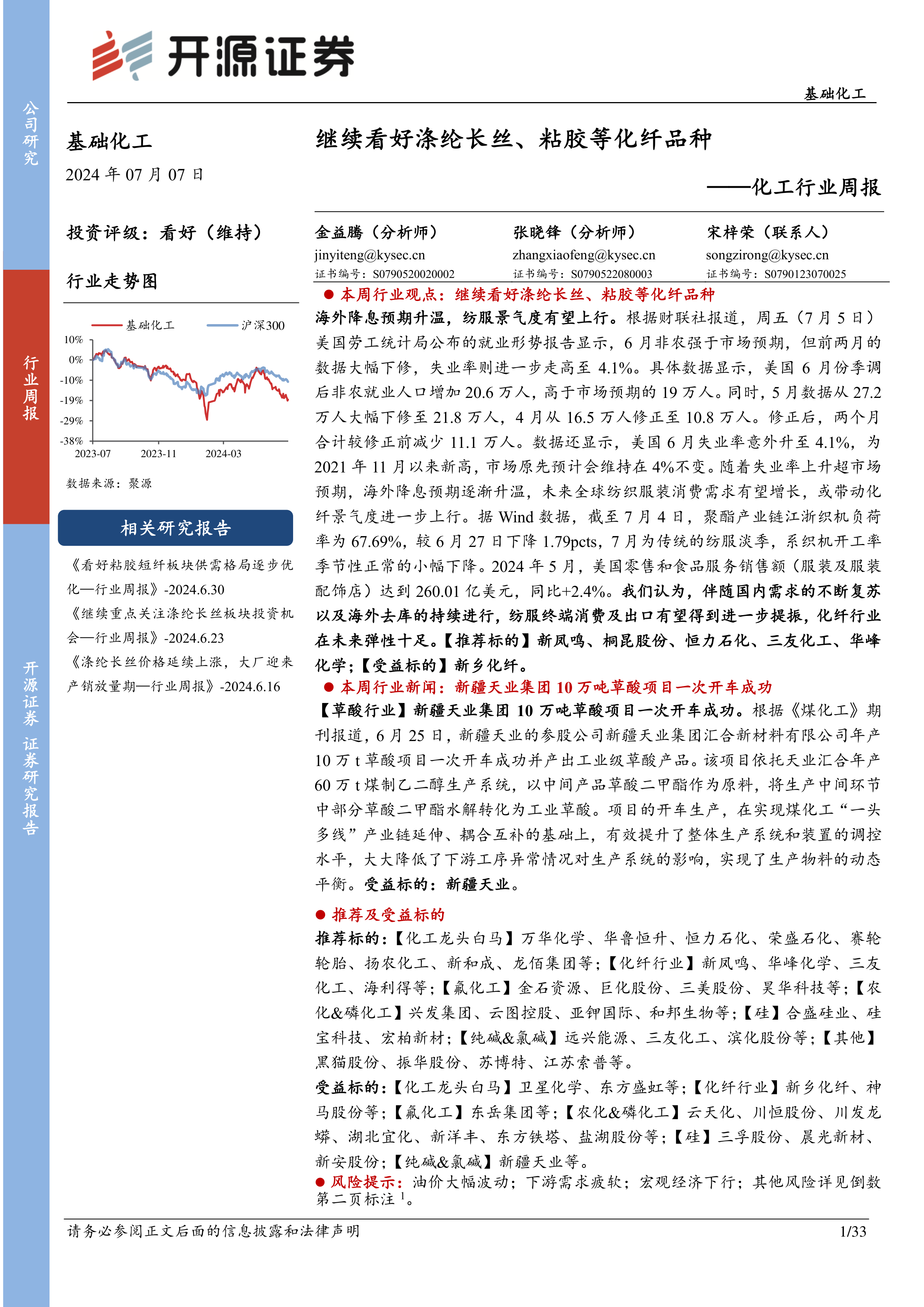 本报告基于对宏观经济形势、行业发展趋势以及公司基本面的综合分析,继续看好涤纶长丝、粘胶等化纤品种的市场前景。 美国降息预期升温以及国内需求复苏将推动纺服行业景气度上行,进而带动化纤行业发展。报告同时对纯碱、化肥、石化、煤化工、磷化工、农化、维生素、氨基酸等多个细分领域的重点产品价格和价差进行了深入分析,并对多家上市公司的业绩和未来发展潜力进行了评估,为投资者提供了较为全面的行业和个股投资参考。 然而,报告也提示了油价大幅波动、下游需求疲软以及宏观经济下行等潜在风险,投资者需谨慎决策。
