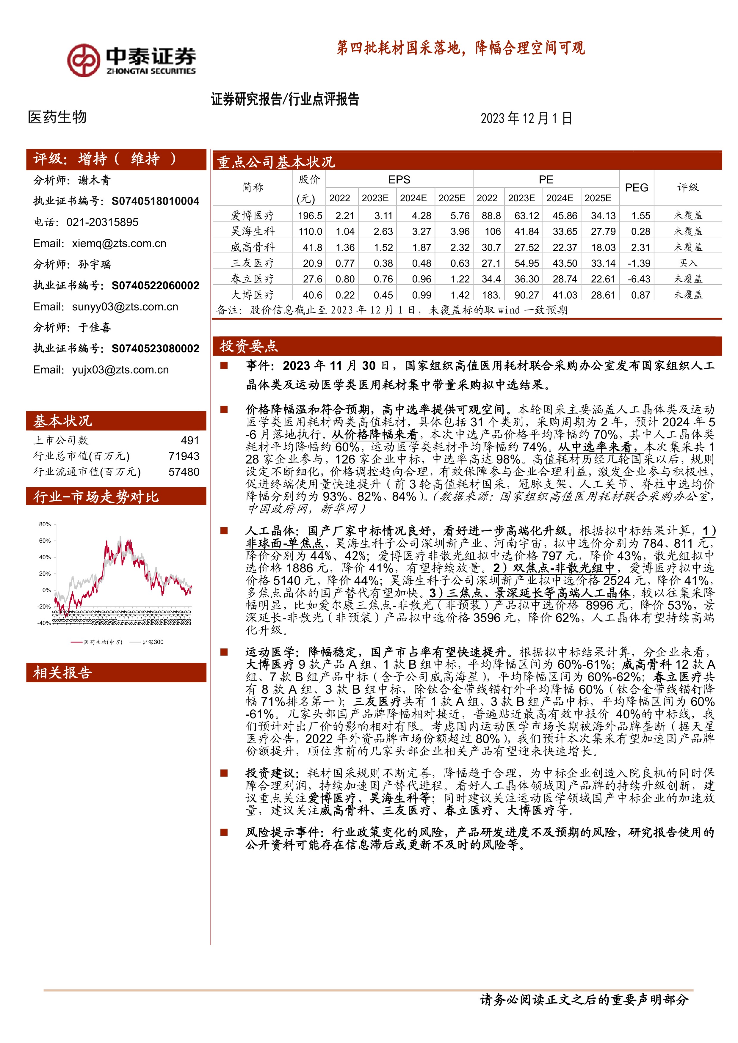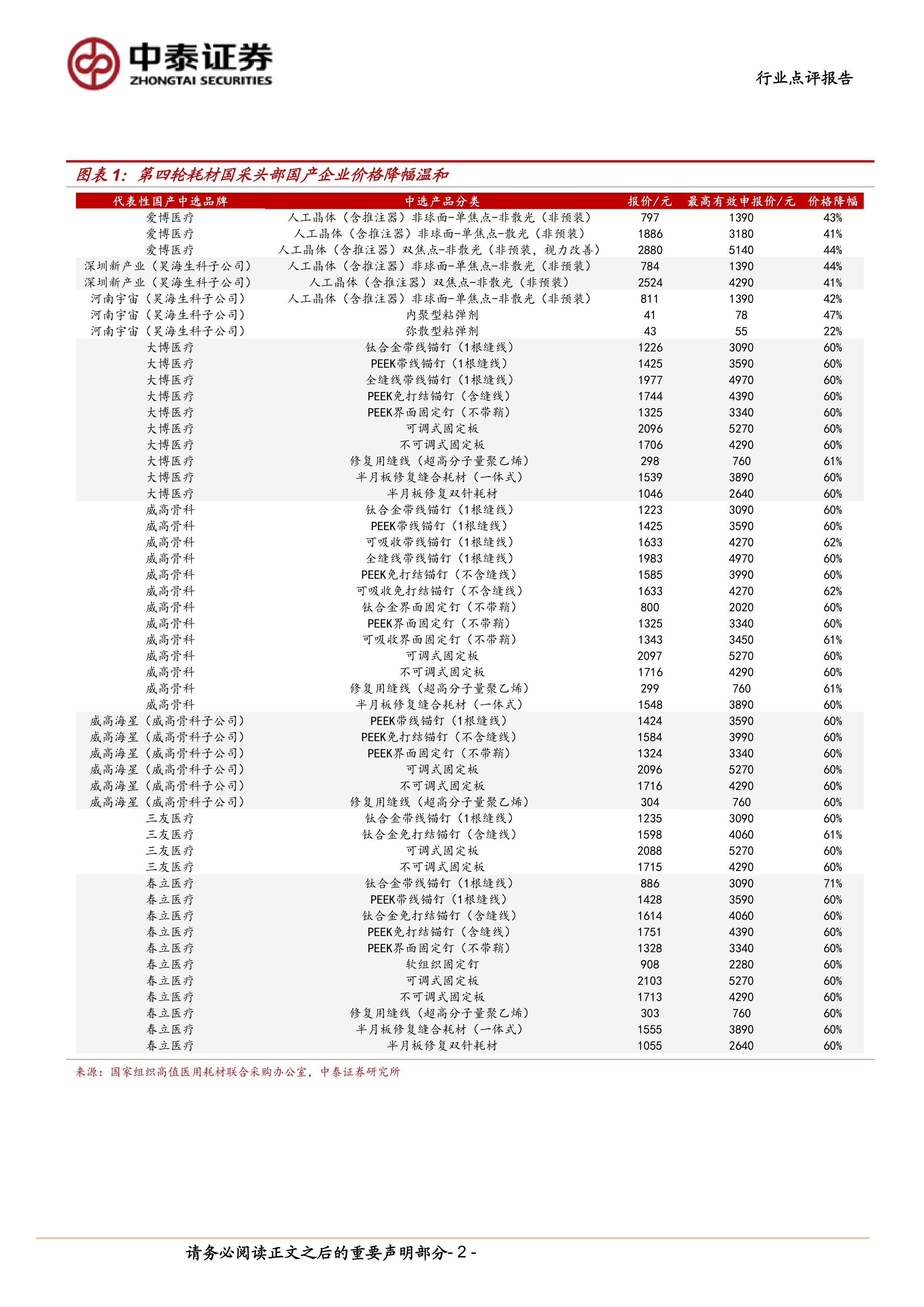 本报告的核心观点是:第四批耗材国采落地,价格降幅合理,为国产企业提供了可观的市场空间。人工晶体和运动医学类耗材的国产替代进程将加速,部分头部国产企业有望迎来快速增长。