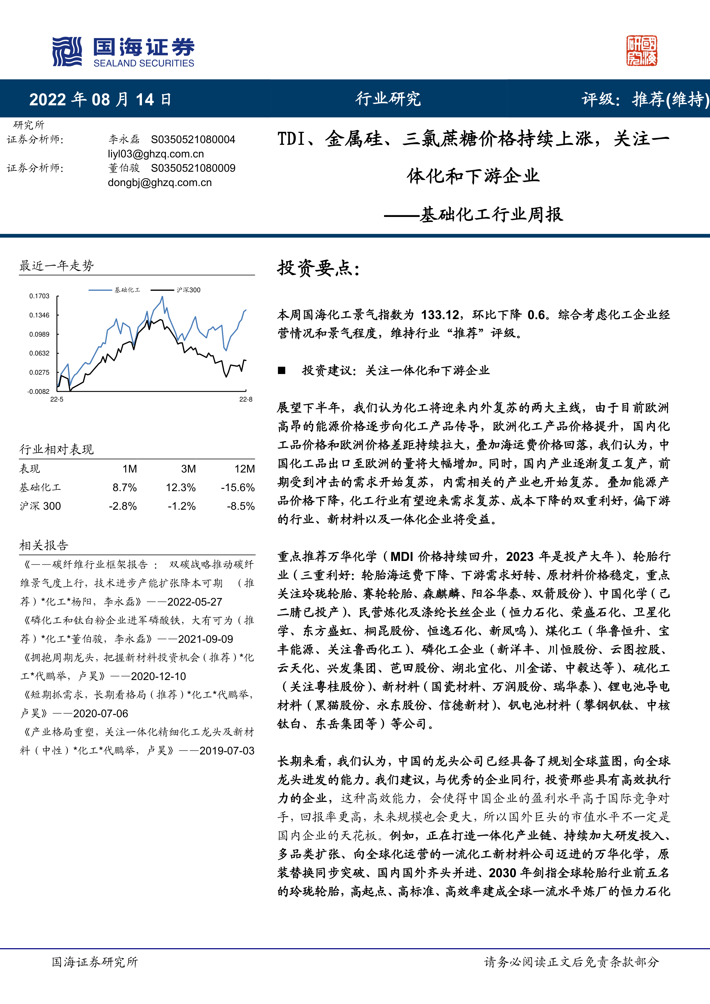 本报告的核心观点是:基于对TDI、金属硅、三氯蔗糖等基础化工产品价格持续上涨的观察,以及对宏观经济形势和行业景气度的分析,国海证券维持基础化工行业“推荐”评级,并建议关注一体化和下游企业。下半年,欧洲高昂的能源价格传导至化工产品,导致国内外价格差距扩大,叠加海运费下降,利好中国化工产品出口欧洲。同时,国内产业复工复产,内需复苏,能源价格下降,化工行业有望迎来需求复苏和成本下降的双重利好。