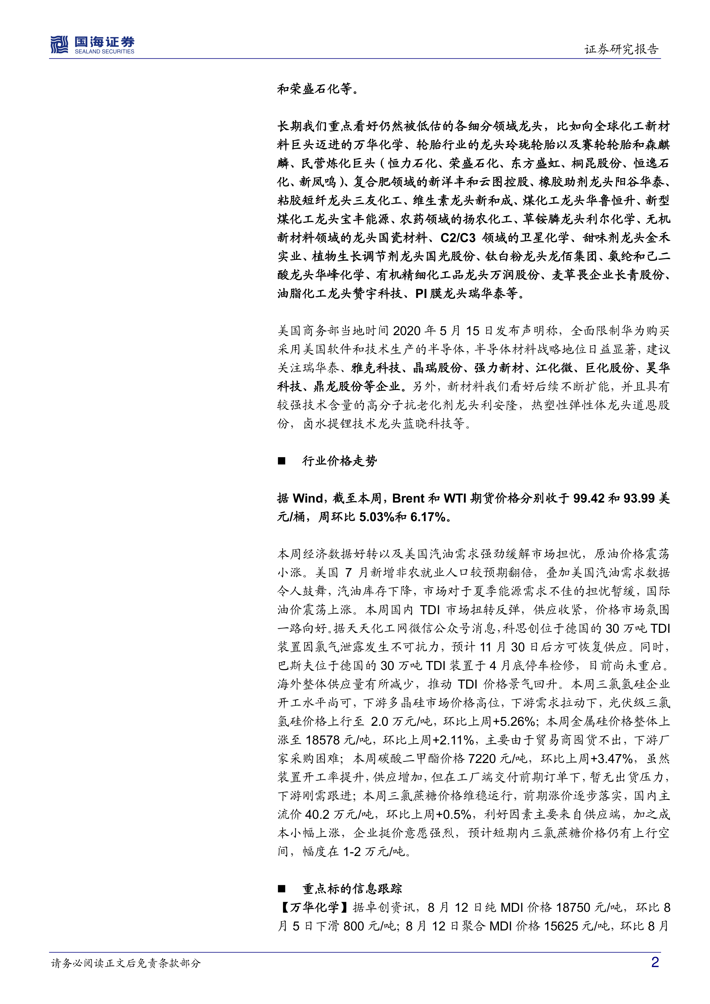 报告详细跟踪了多家重点化工企业的近期动态,包括万华化学(MDI价格波动、新实验室揭牌、新船命名)、玲珑轮胎(战略合作、银行授信、澄清公告)、赛轮轮胎(担保公告)、森麒麟(广汽埃安合作、股东减持)、恒力石化(涤纶长丝和PTA库存及价格)、荣盛石化(股票回购)、东方盛虹(增资公告、EVA价格)、恒逸石化(新增借款)、卫星化学(丙烯酸价格、新项目签约)、桐昆股份(技术改造项目)、新凤鸣、新洋丰(半年报、磷酸一铵和复合肥价格)、云图控股、龙佰集团(钛白粉价格、企业荣誉)、中毅达、中国化学(担保公告)、阳谷华泰(橡胶助剂价格、股份质押延期)、双箭股份(可转债转股)、华峰化学(氨纶价格)、新和成(维生素A和E价格)、三友化工(粘胶短纤和纯碱价格)、华鲁恒升(乙二醇和尿素价格)、宝丰能源(半年报)、金禾实业(甜味剂价格)、瑞华泰(股东减持)、赞宇科技(半年报)、国瓷材料(计量技术规范立项)、扬农化工(功夫菊酯价格)、利尔化学(半年报、草铵膦价格)、国光股份(软件著作权登记)、长青股份、金发科技、道恩股份、万润股份、利安隆(股东减持)、雅克科技、江化微、蓝晓科技、盐湖股份(碳酸锂价格、股份划转、收购公告)、粤桂股份(硫磺和硫酸价格)、黑猫股份、永东股份、信德新材、攀钢钒钛、中核钛白、东岳集团等公司。 报告对这些公司的财务数据、市场表现和未来发展前景进行了分析。