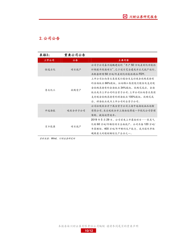 恒逸石化子公司“年产50万吨差别化功能性纤维提升改造项目”投产;鲁北化工收购金海钛业和祥海钛业股权;中远海能吸收合并子公司;宝丰能源焦炭气化制烯烃项目全面投产。这些公告信息反映了企业在产能扩张、产业整合等方面的动态。