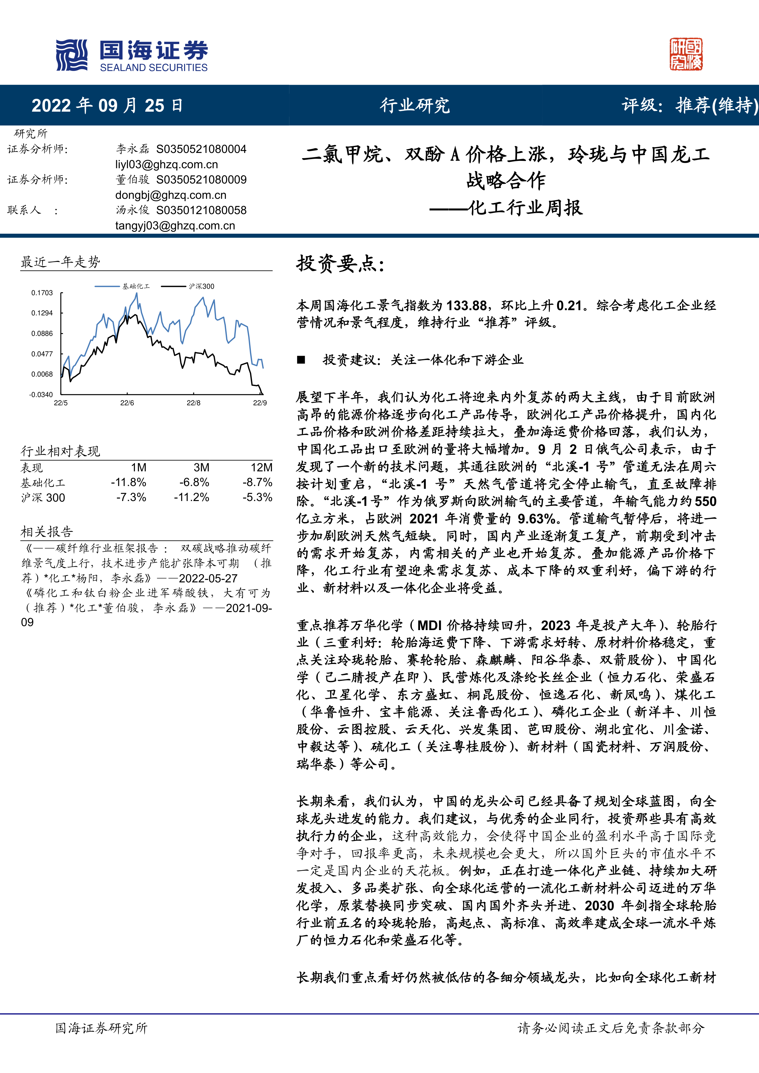 本报告对2022年下半年化工行业进行了全面的分析,基于欧洲能源危机带来的出口机遇和国内经济复苏带来的内需增长,维持行业“推荐”评级。报告详细跟踪了重点化工产品的价格走势和重点公司的经营状况,并提供了具体的投资建议,为投资者提供了有价值的参考信息。 然而,报告也指出了宏观经济变化、油价波动、环保政策等潜在风险,投资者需谨慎决策。