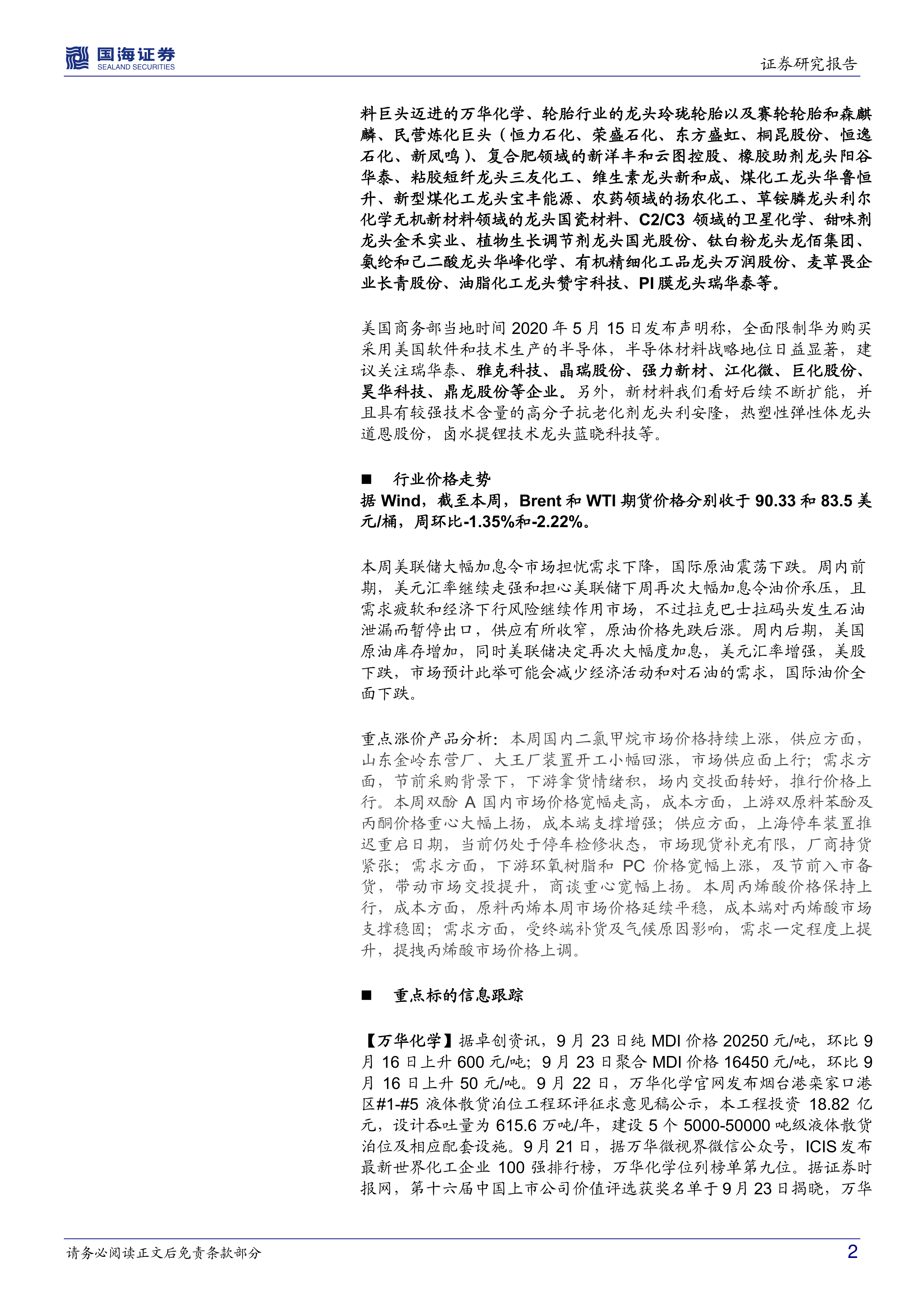 报告首先指出本周国海化工景气指数为133.88,环比上升0.21%,并基于此维持行业“推荐”评级。 报告还分析了国际原油价格走势,指出美联储大幅加息导致市场担忧需求下降,国际原油震荡下跌。