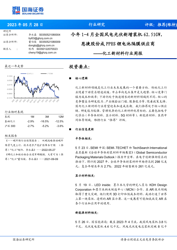 化工新材料行业周报:今年1-4月全国风电光伏新增装机62.51GW,恩捷股份成PPES锂电池隔膜供应商