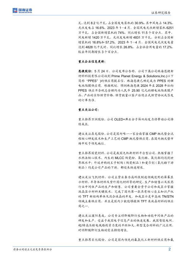 行业信息: 报告重点关注了国家能源局发布的我国风电光伏新增装机和发电量数据,以及贵州省能源局关于新型储能项目管理办法的通知,突显了新能源行业的高速发展和政策导向。