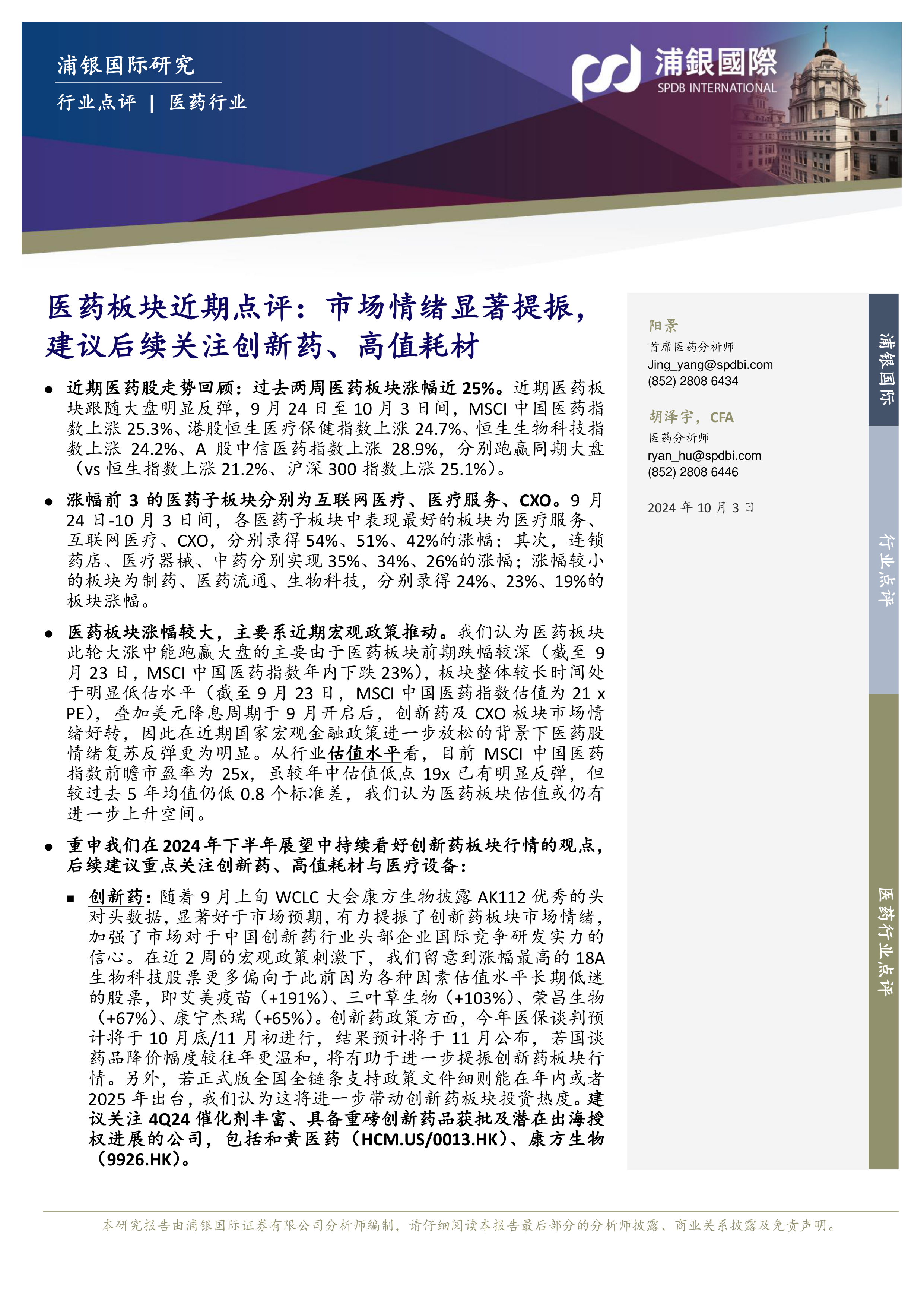 本报告的核心观点是:近期医药板块强势反弹,涨幅显著,主要受宏观政策利好和市场情绪提振驱动。浦银国际研究建议投资者后续关注创新药、高值耗材与医疗设备板块,并推荐了部分首选标的。