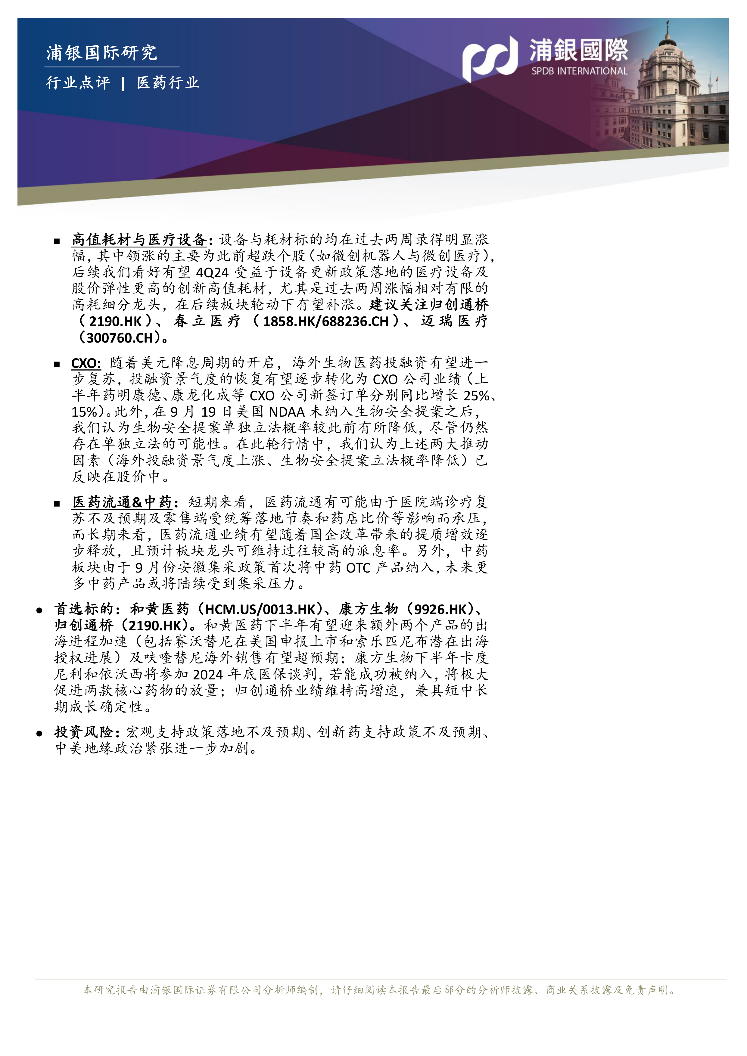 报告看好4Q24受益于设备更新政策落地的医疗设备及股价弹性更高的创新高值耗材,建议关注归创通桥(2190.HK)、春立医疗(1858.HK/688236.CH)、迈瑞医疗(300760.CH)。