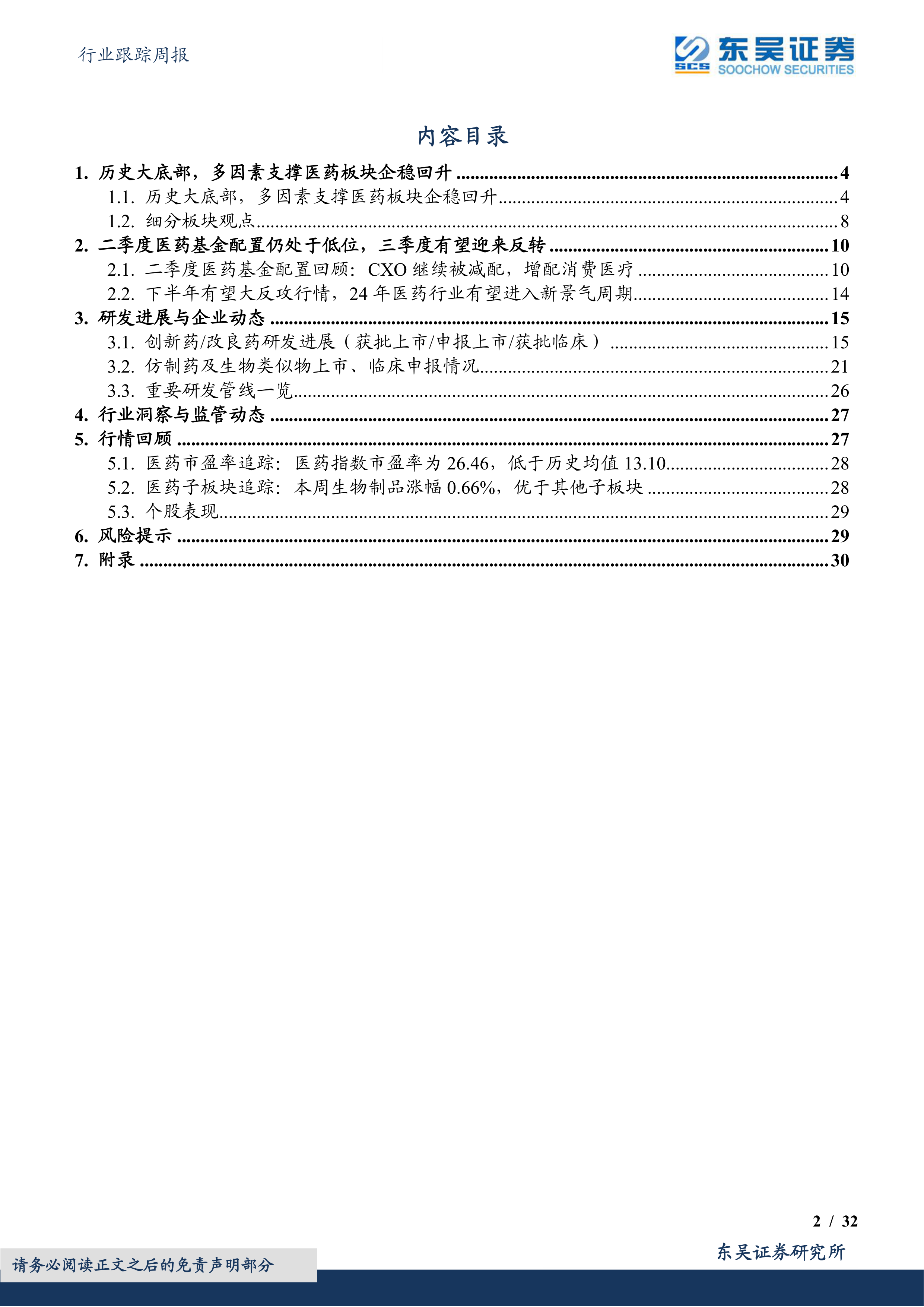 本报告基于对市场数据的分析,认为医药板块已触底,并有望迎来企稳回升。多重因素支撑了这一判断,包括基金配置的积极变化、创新药研发的持续推进、行业政策的利好以及板块估值的低位。报告针对不同细分板块给出了具体的投资建议,并提示了药品或耗材降价超预期、销售下滑以及医保政策风险等潜在风险。投资者应根据自身情况谨慎投资。