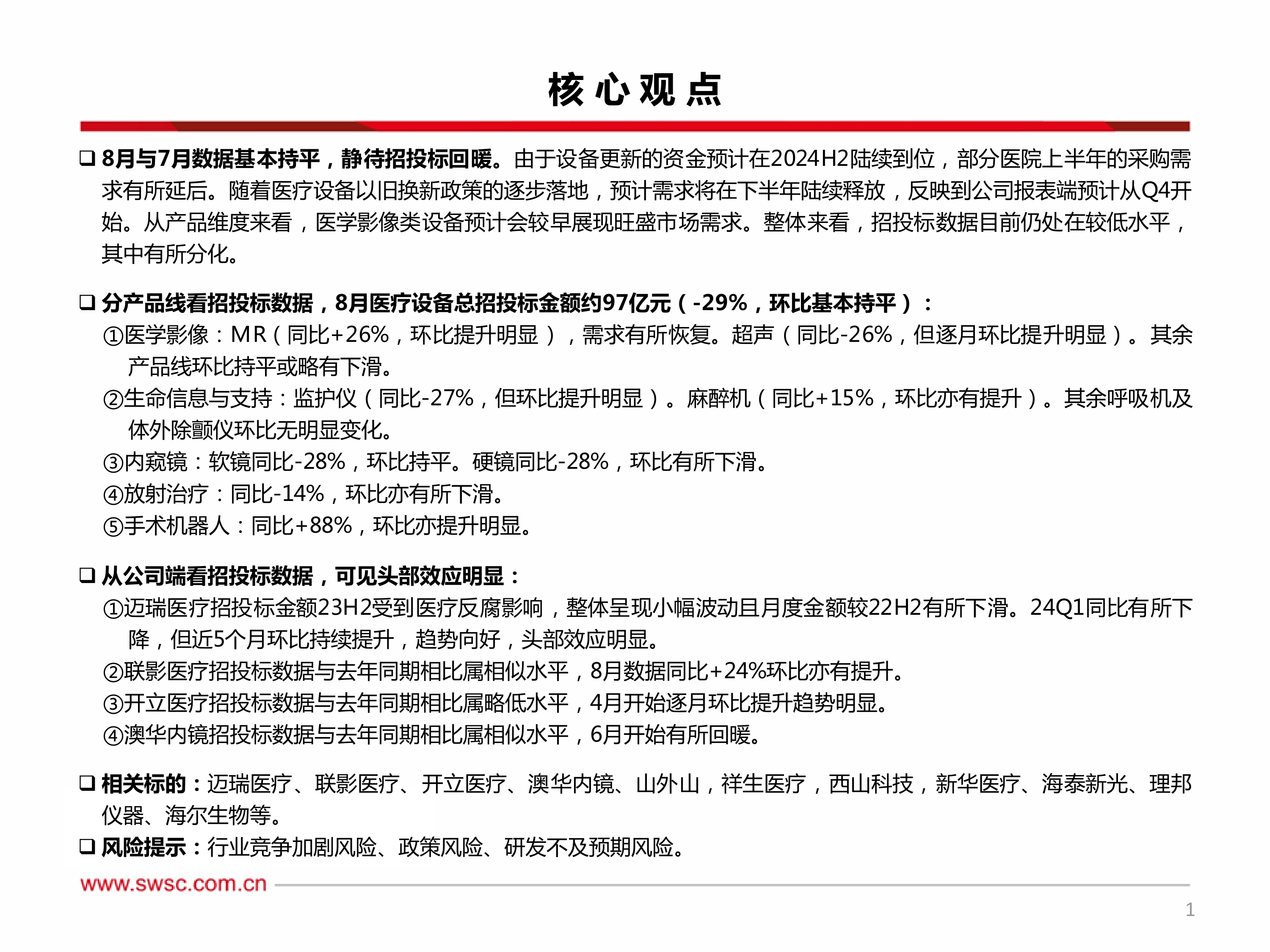 8月与7月数据基本持平,静待招投标回暖。由于设备更新的资金预计在2024H2陆续到位,部分医院上半年的采购需求有所延后。随着医疗设备以旧换新政策的逐步落地,预计需求将在下半年陆续释放,反映到公司报表端预计从Q4开始。从产品维度来看,医学影像类设备预计会较早展现旺盛市场需求。整体来看,招投标数据目前仍处在较低水平,其中有所分化。