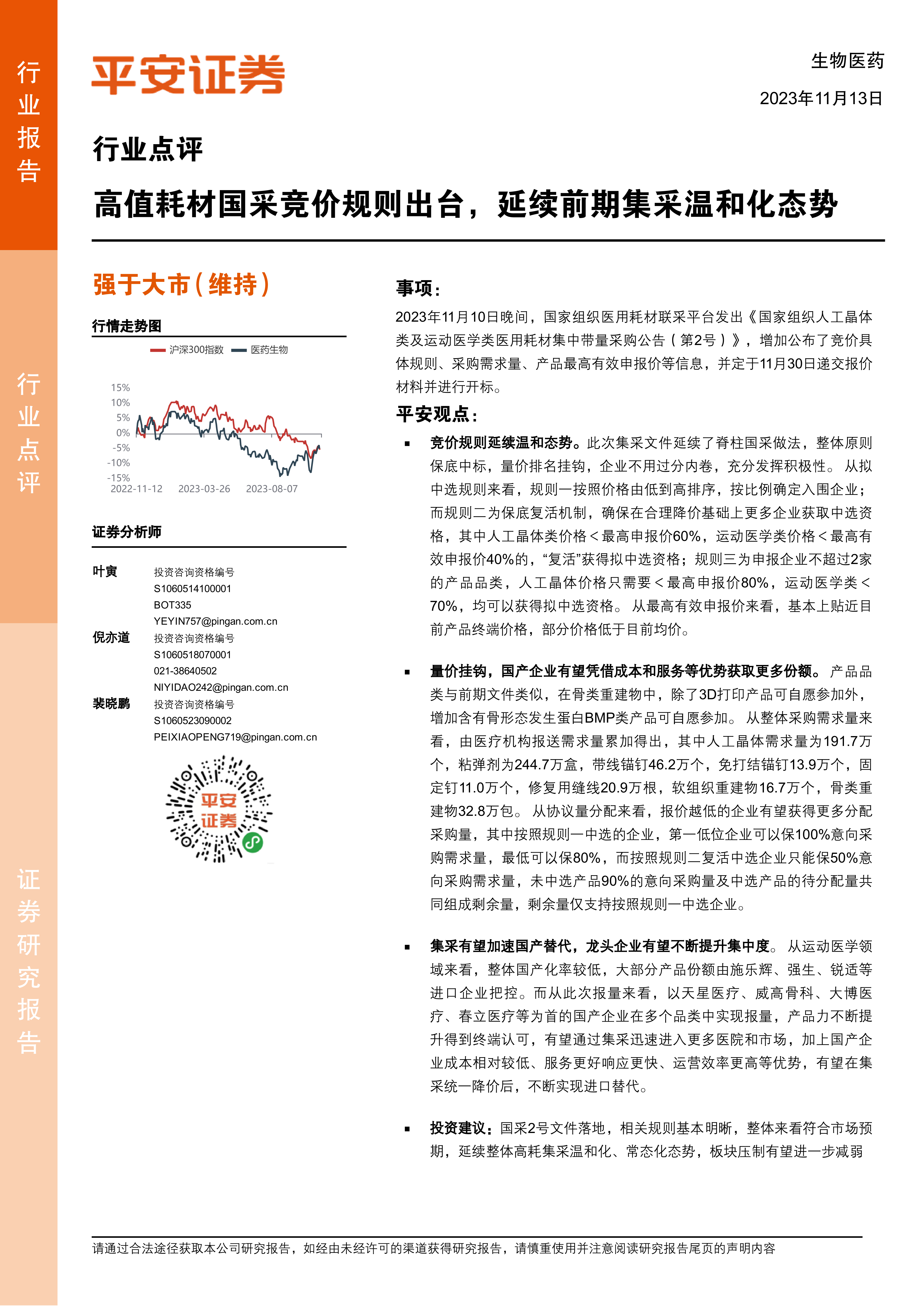 本次报告的核心观点是:国家组织人工晶体及运动医学类医用耗材集中带量采购(第2号)公告的发布,延续了前期集采温和化态势,竞价规则相对温和,有利于国产企业发展,并有望加速国产替代进程。 报告预测,相关优质龙头企业将受益于此政策,市场表现强于大市。