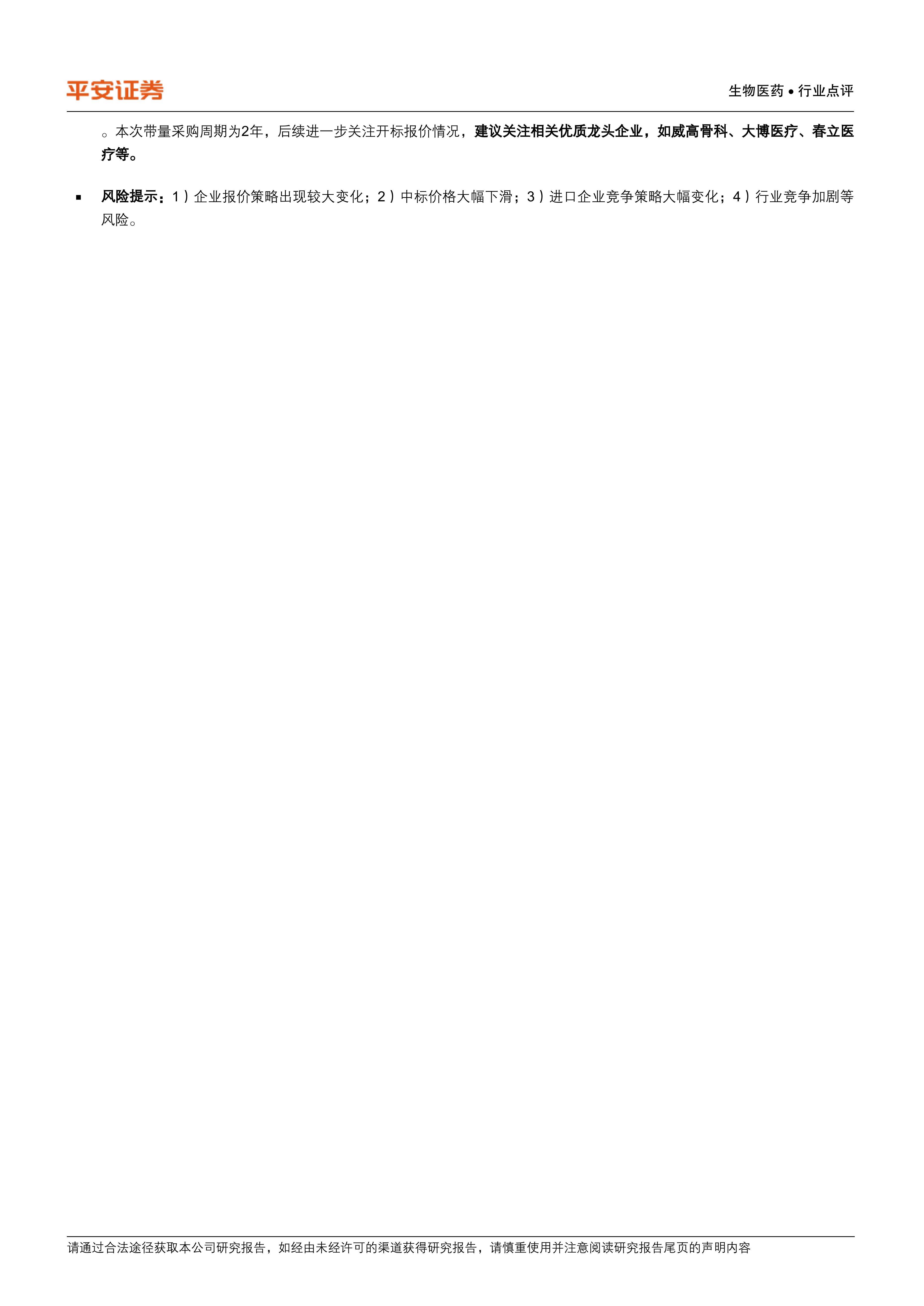 投资建议:国采2号文件落地,相关规则基本明晰,整体来看符合市场预期,延续整体高耗集采温和化、常态化态势,板块压制有望进一步减弱。本次带量采购周期为2年,后续进一步关注开标报价情况,建议关注相关优质龙头企业,如威高骨科、大博医疗、春立医疗等。
