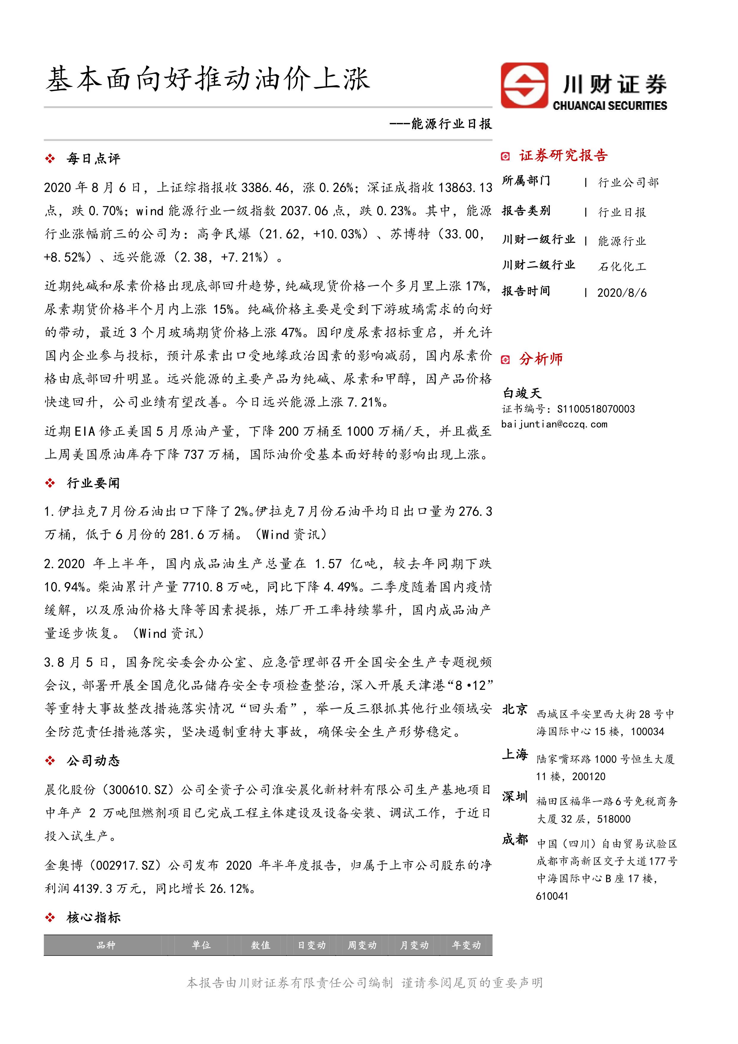 报告日期为2020年8月6日,上证综指上涨0.26%,深证成指下跌0.70%,Wind能源行业一级指数下跌0.23%。高争民爆、苏博特、远兴能源涨幅居前。