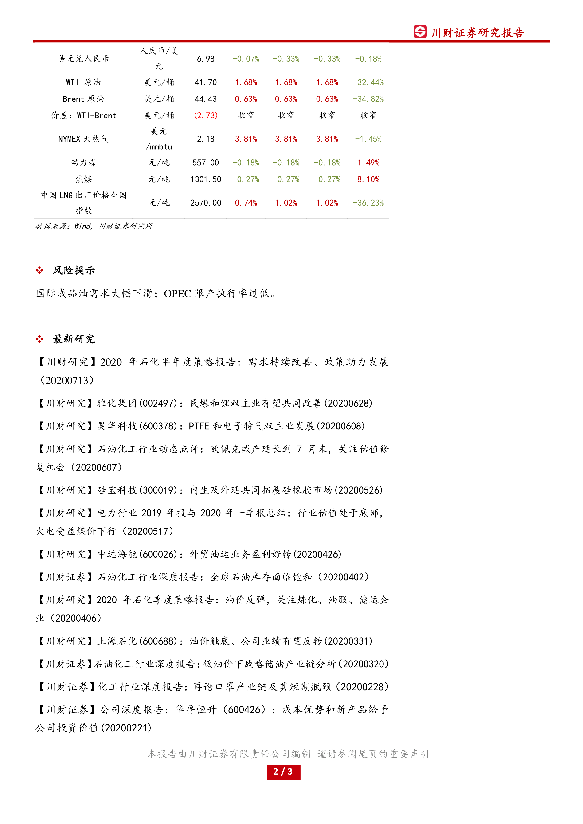 本报告对2020年8月6日能源行业市场进行了分析,指出基本面改善推动油价上涨,部分化工产品价格回升,但整体能源行业指数表现平稳略有下跌。国际油价上涨主要受益于美国原油产量下降和库存减少;国内化工品市场,纯碱和尿素价格回升,带动相关公司业绩改善。报告还提示了国际成品油需求大幅下滑和OPEC限产执行率过低的风险,并提供了多篇相关研究报告以供参考。 整体而言,报告数据翔实,分析客观,为投资者提供了较为全面的市场信息和分析视角。 然而,报告信息仅限于2020年8月6日,其结论和预测的有效性受时间限制,需结合最新的市场动态进行综合判断。