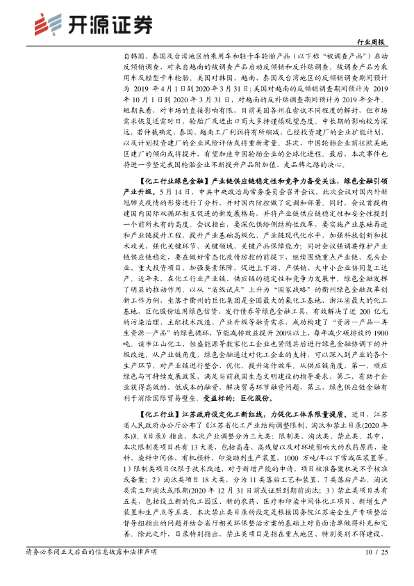 报告还对美国钢铁工人联合会申请轮胎“双反”调查、中央政治局常委会研究提升产业链供应链稳定性和竞争力、江苏政府设定化工新红线以及第二阶段HCFCs行业淘汰计划修订启动等行业新闻进行了点评,并分析了这些事件对化工行业的影响。