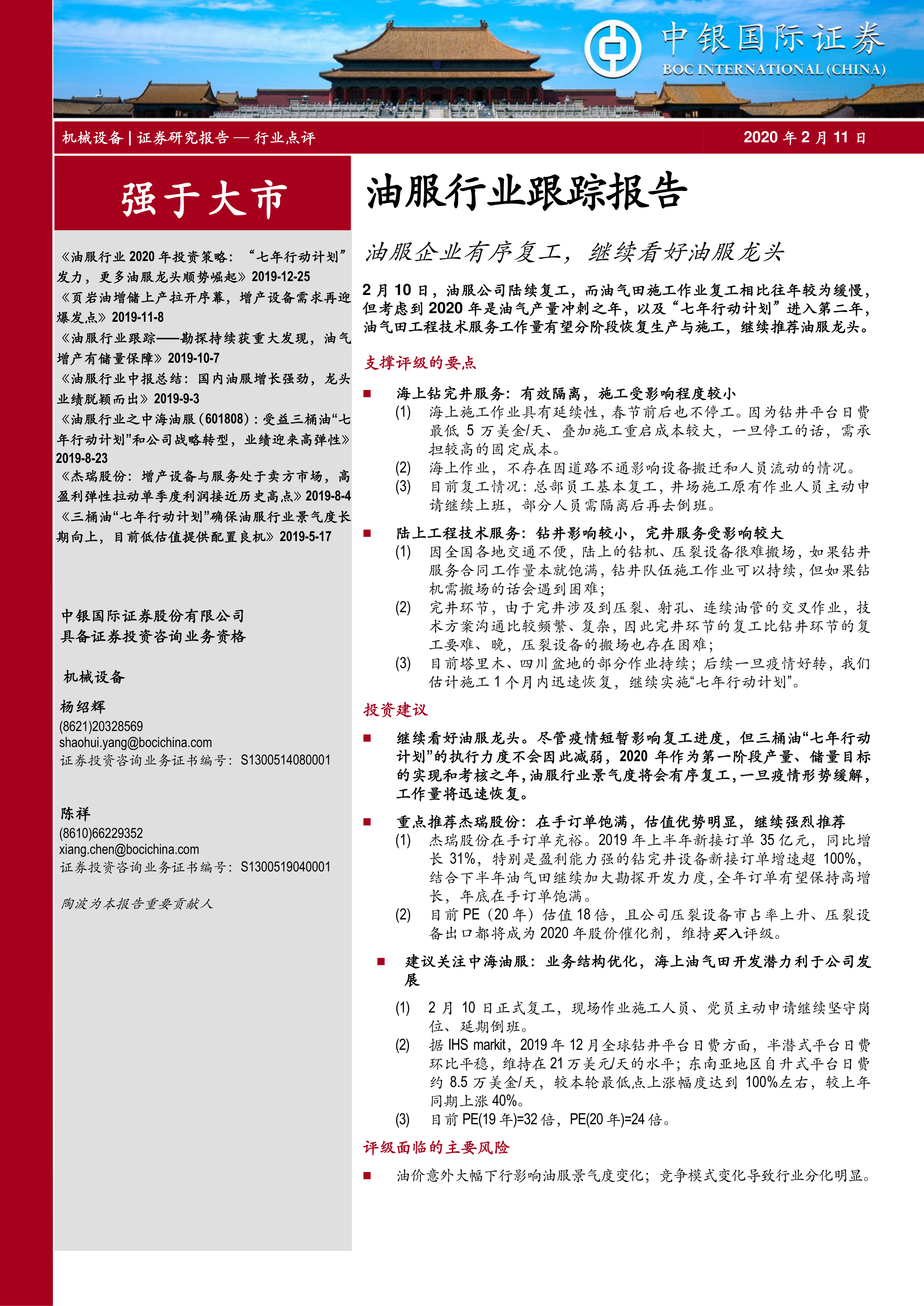 本报告为中银国际证券股份有限公司于2020年2月11日发布的《机械设备 | 证券研究报告 — 行业点评 2020年2月11日》油服行业跟踪报告。报告基于对油服行业复工情况的分析,以及对“七年行动计划”的解读,对行业未来发展趋势和重点企业进行了展望。