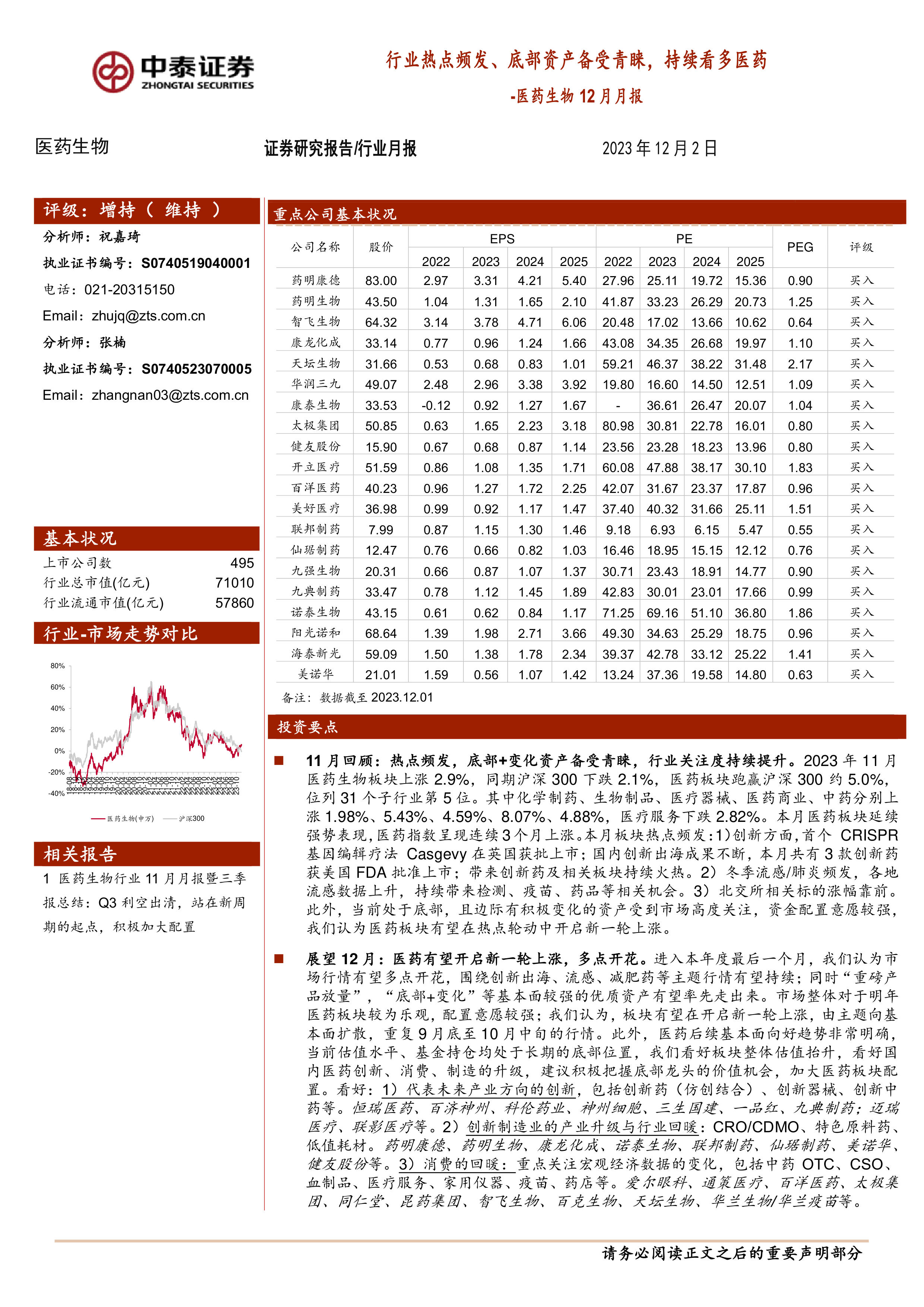 展望12月:医药有望开启新一轮上涨,多点开花。进入本年度最后一个月,我们认为市场行情有望多点开花,围绕创新出海、流感、减肥药等主题行情有望持续;同时“重磅产品放量”,“底部+变化”等基本面较强的优质资产有望率先走出来。市场整体对于明年医药板块较为乐观,配置意愿较强;我们认为,板块有望在开启新一轮上涨,由主题向基本面扩散,重复9月底至10月中旬的行情。此外,医药后续基本面向好趋势非常明确,当前估值水平、基金持仓均处于长期的底部位置,我们看好板块整体估值抬升,看好国内医药创新、消费、制造的升级,建议积极把握底部龙头的价值机会,加大医药板块配置。看好:1)代表未来产业方向的创新,包括创新药(仿创结合)、创新器械、创新中药等。恒瑞医药、百济神州、科伦药业、神州细胞、三生国建、一品红、九典制药;迈瑞医疗、联影医疗等。2)创新制造业的产业升级与行业回暖:CRO/CDMO、特色原料药、低值耗材。药明康德、药明生物、康龙化成、诺泰生物、联邦制药、仙琚制药、美诺华、健友股份等。3)消费的回暖:重点关注宏观经济数据的变化,包括中药OTC、CSO、血制品、医疗服务、家用仪器、疫苗、药店等。爱尔眼科、通策医疗、百洋医药、太极集团、同仁堂、昆药集团、智飞生物、百克生物、天坛生物、华兰生物/华兰疫苗等。