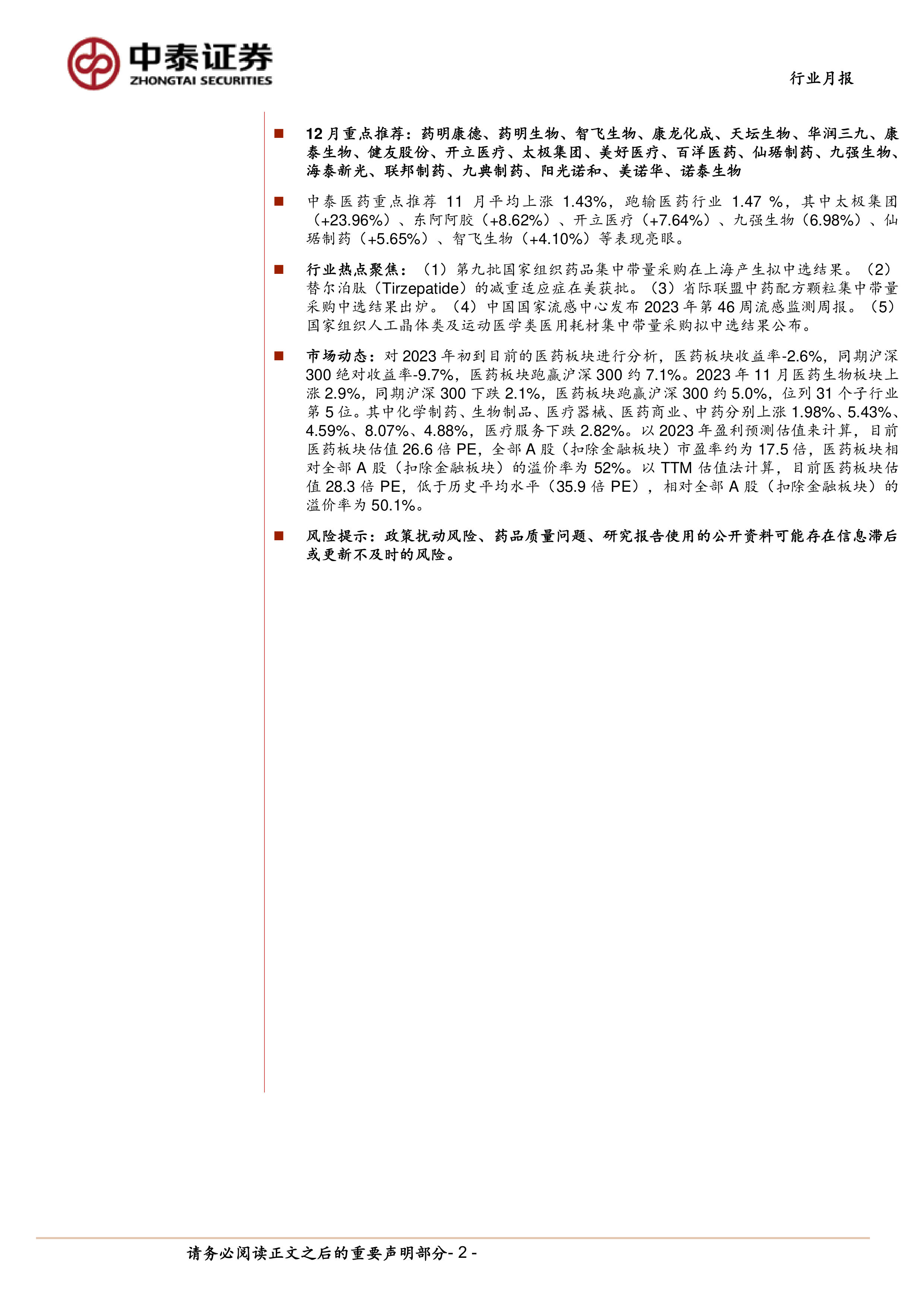 本报告的核心观点是:医药板块在11月延续强势,12月有望开启新一轮上涨,呈现多点开花态势。 主要驱动因素包括:行业热点频发(创新药出海、流感疫情、减肥药等)、底部资产备受青睐以及市场对明年医药板块的乐观预期。报告建议积极配置医药板块,尤其关注创新药、创新制造业升级以及消费回暖相关的优质龙头企业。