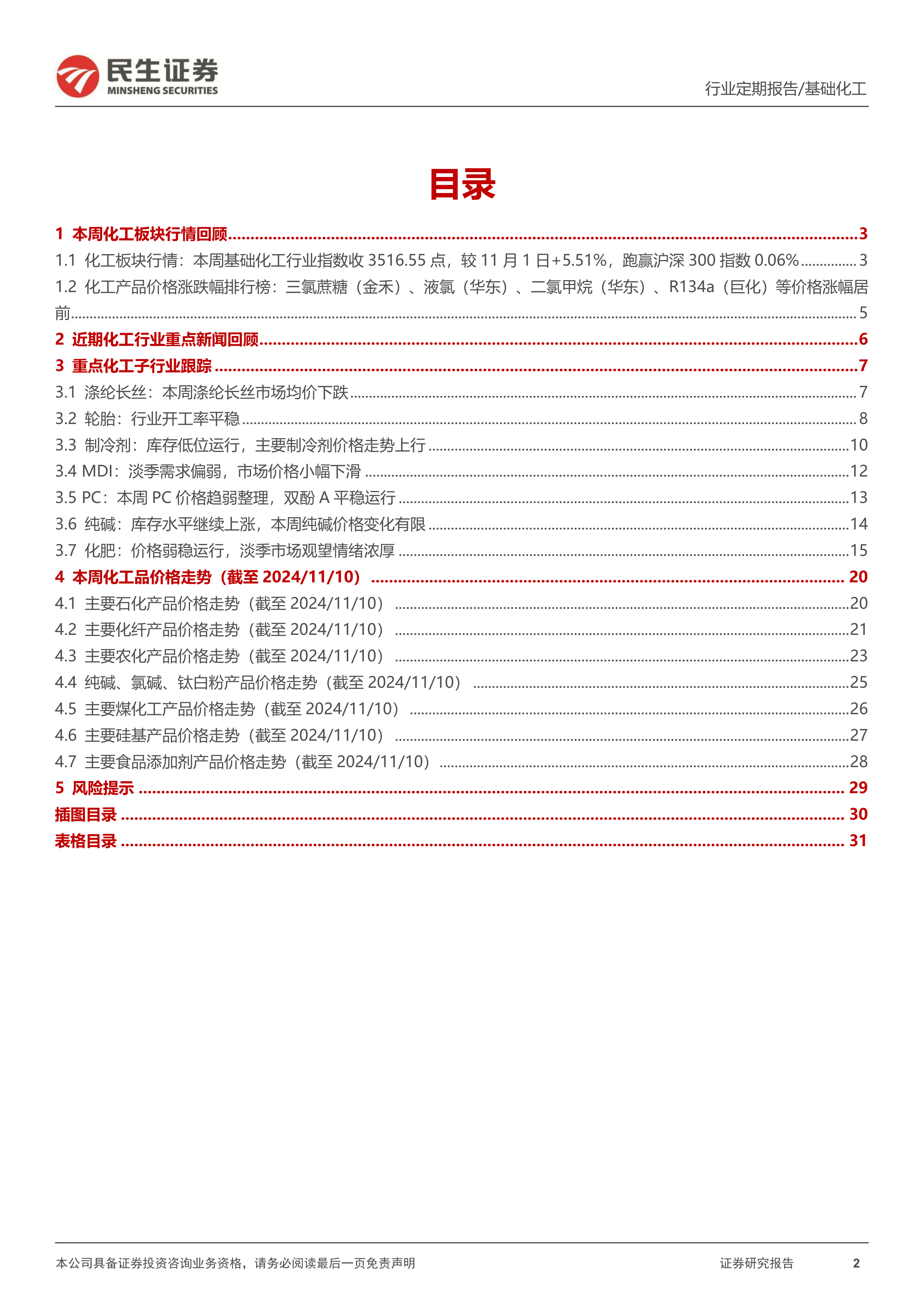 报告对涤纶长丝、轮胎、制冷剂、MDI、PC、纯碱、化肥等多个重点化工子行业进行了深入的跟踪分析,内容包括: