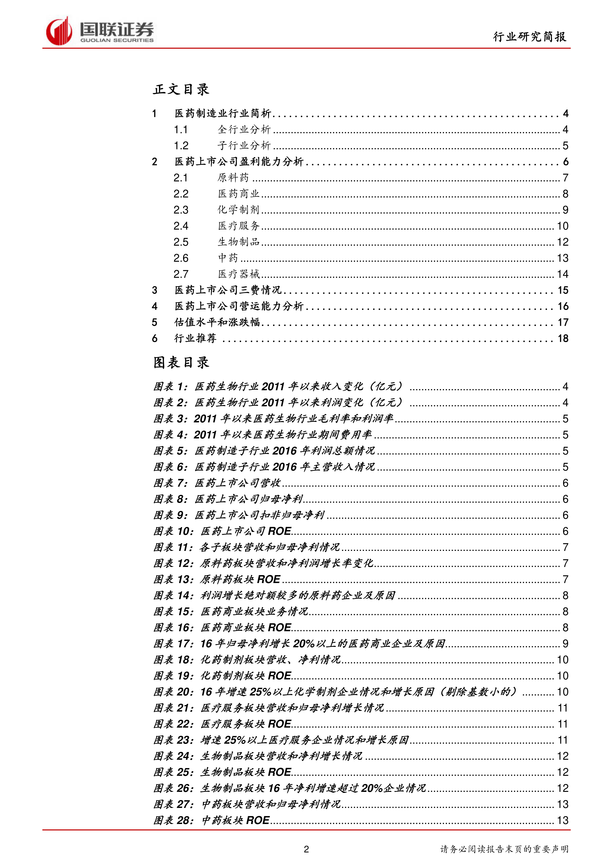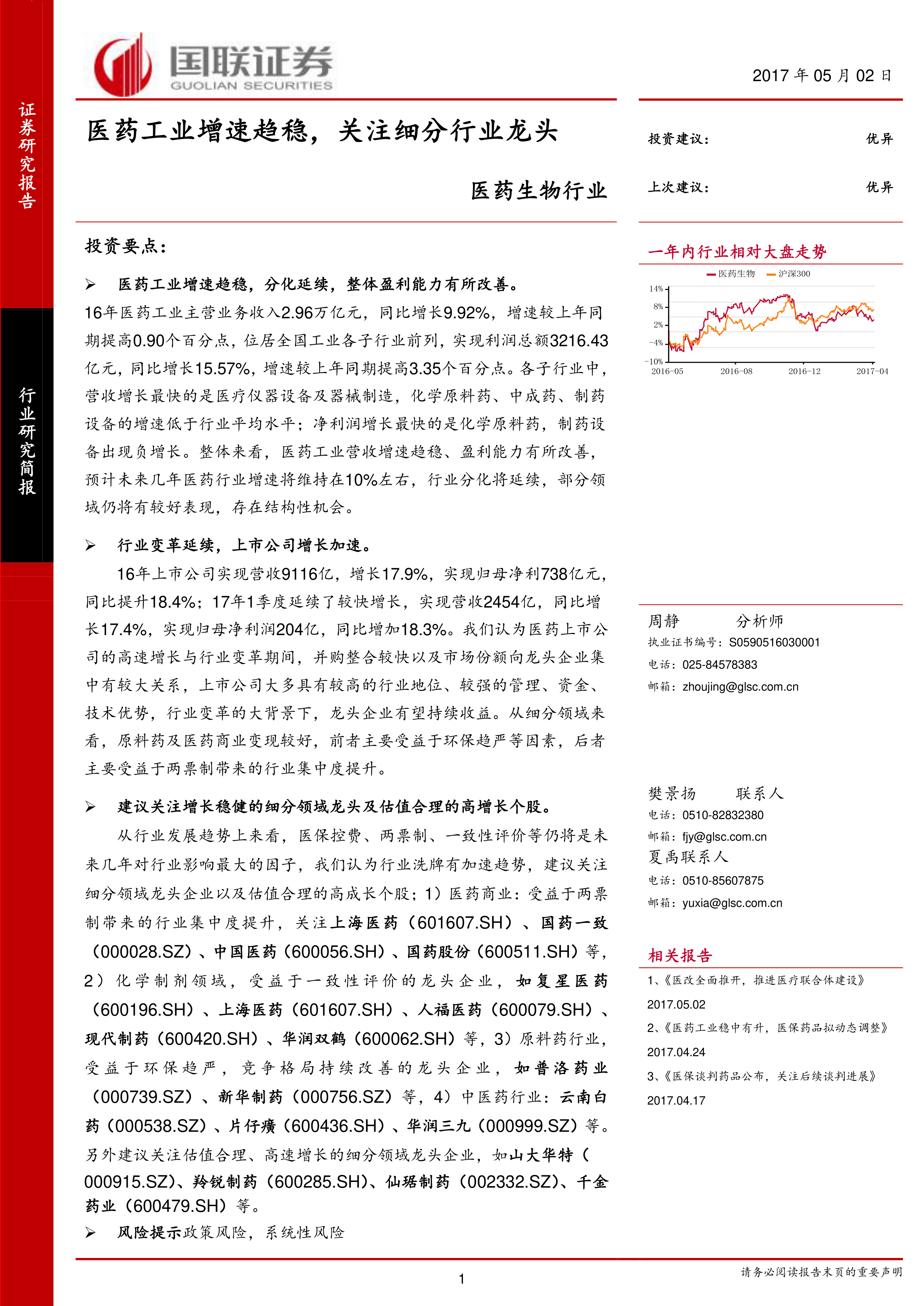 本报告基于公开数据,对2016年中国医药行业及上市公司进行了全面的分析。报告指出,医药行业增速趋稳,盈利能力提升,行业分化加剧,龙头企业受益于行业变革和政策红利。未来,医保控费、两票制、一致性评价等政策将持续影响行业发展,行业洗牌加速,建议投资者关注细分领域龙头企业及估值合理的公司,谨慎投资。 报告中大量图表数据清晰地展现了行业和上市公司的各项关键指标,为投资者提供了有价值的参考信息。 然而,报告也提示了政策风险和系统性风险,投资者需谨慎决策。