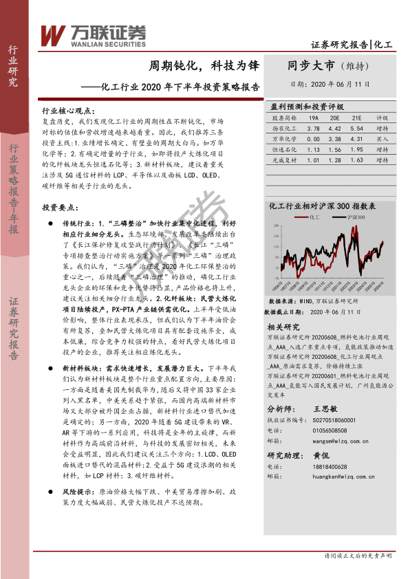本报告的核心观点是:化工行业周期性正在钝化,市场对标的估值和营收增速越来越看重。报告推荐三条投资主线:业绩增长确定、有壁垒的周期大白马;有确定增量的子行业;新材料板块(重点关注5G通信材料、半导体及面板相关材料)。报告基于2020年上半年化工行业市场表现、经营情况及下半年市场展望,对磷化工、化纤、新材料等重点子行业及相关上市公司进行了深入分析,并提出了相应的投资建议。