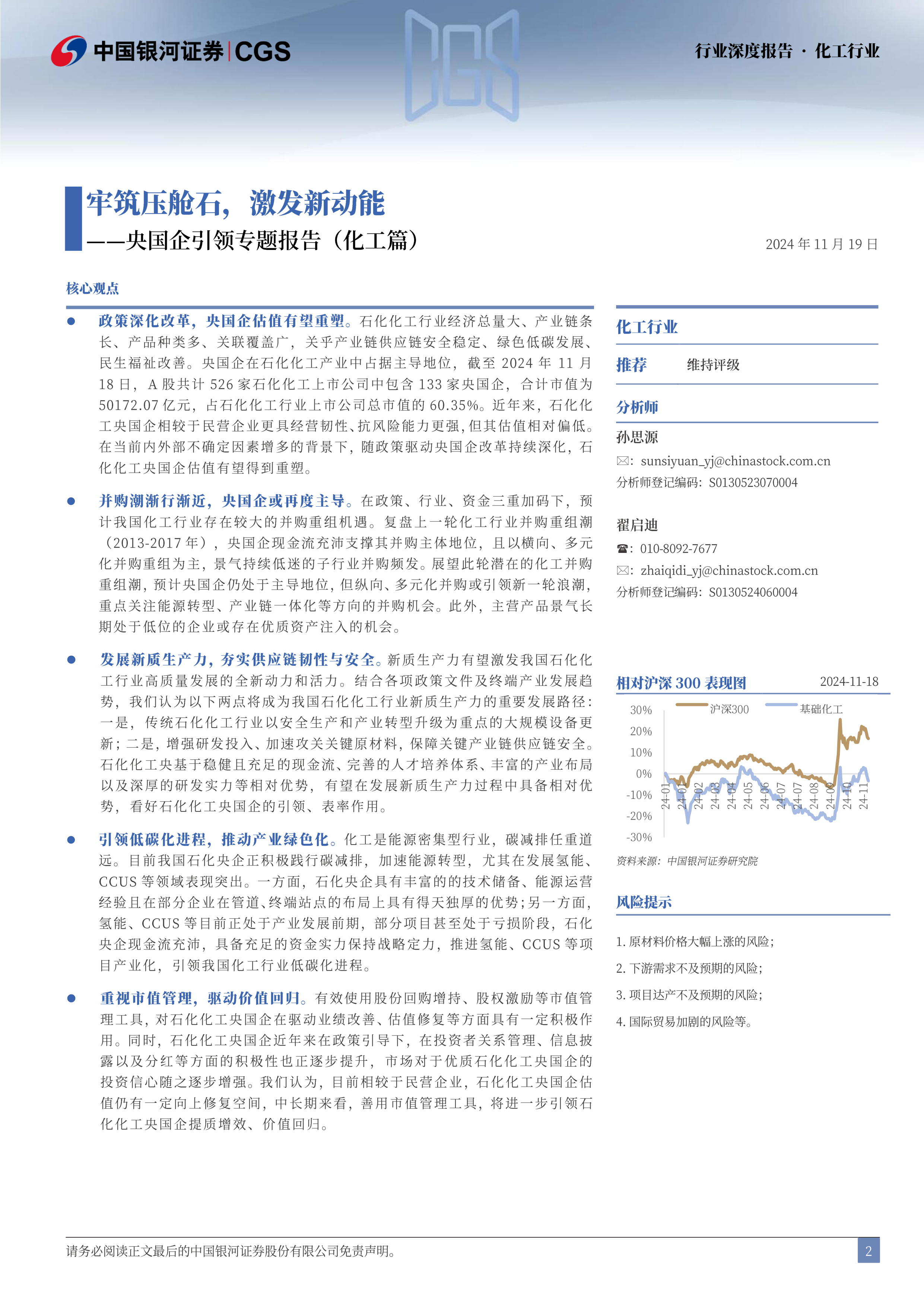 政策深化改革,央国企估值有望重塑。石化化工行业经济总量大、产业链条长、产品种类多、关联覆盖广,关乎产业链供应链安全稳定、绿色低碳发展、民生福祉改善。央国企在石化化工产业中占据主导地位,截至2024年11月18日,A股共计526家石化化工上市公司中包含133家央国企,合计市值为50172.07亿元,占石化化工行业上市公司总市值的60.35%。近年来,石化化工央国企相较于民营企业更具经营韧性、抗风险能力更强,但其估值相对偏低。在当前内外部不确定因素增多的背景下,随政策驱动央国企改革持续深化,石化化工央国企估值有望得到重塑。