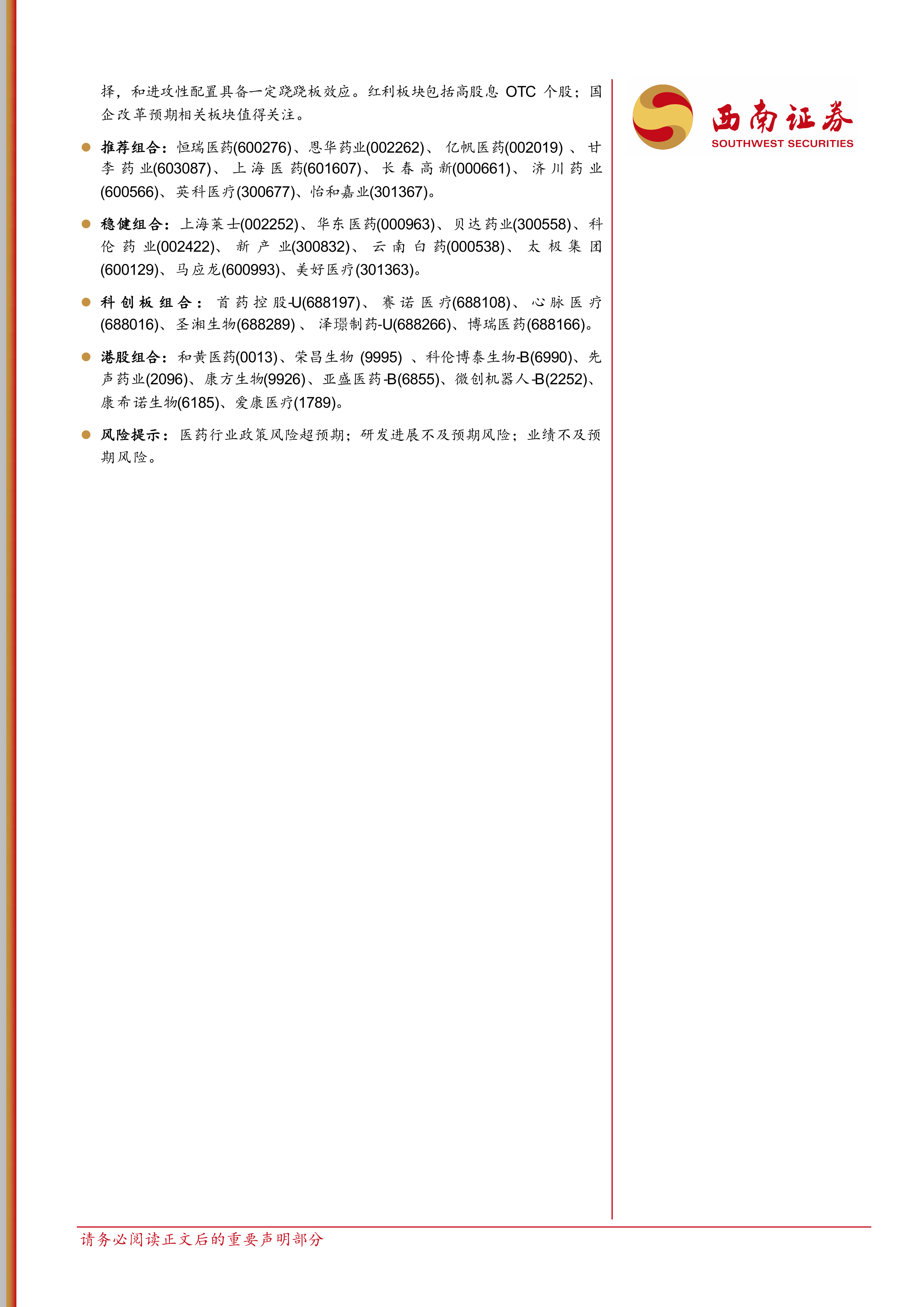 风险提示:医药行业政策风险超预期;研发进展不及预期风险;业绩不及预期风险。