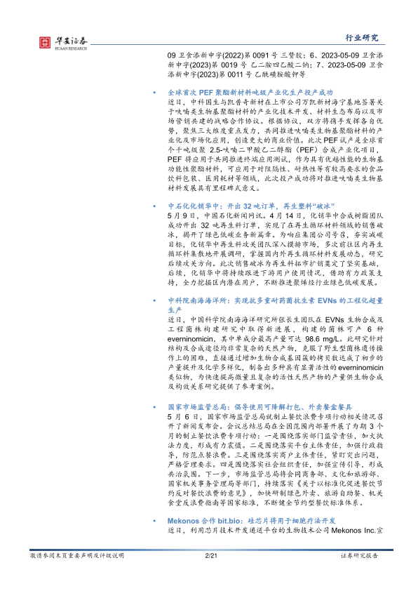 2023年5月9日,国家卫健委对21种食品添加剂新品种不予行政许可公示,产品包括:1、2023-05-09卫食添新申字(2023)第0016号5'-呈味核苷酸二钠;2、2023-05-09卫食添新申字(2023)第0015号D-异抗坏血酸及其钠盐;3、2023-05-09卫食添新申字(2023)第0022号NMN(β-烟酰胺单核苷酸);4、2023-05-09卫食添新申字(2023)第0013号三氯蔗糖(又名蔗糖素);5、2023-05-09卫食添新申字(2022)第0091号三赞胶;6、2023-05-09卫食添新申字(2023)第0019号乙二胺四乙酸二钠;7、2023-05-09卫食添新申字(2023)第0011号乙酰磺胺酸钾等