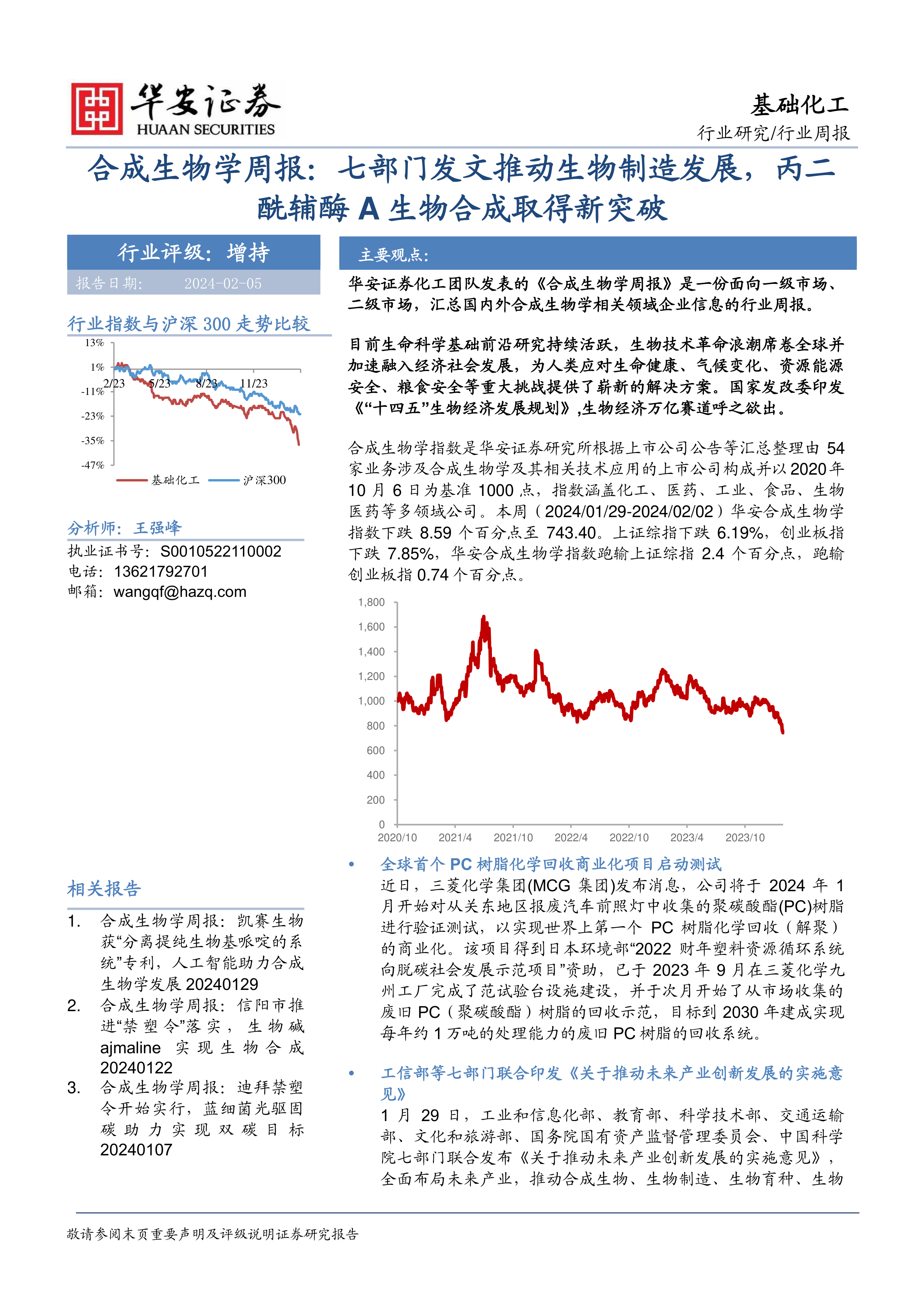 合成生物学指数是华安证券研究所根据上市公司公告等汇总整理由54家业务涉及合成生物学及其相关技术应用的上市公司构成并以2020年10月6日为基准1000点,指数涵盖化工、医药、工业、食品、生物医药等多领域公司。本周(2024/01/29-2024/02/02)华安合成生物学指数下跌8.59个百分点至743.40。上证综指下跌6.19%,创业板指下跌7.85%,华安合成生物学指数跑输上证综指2.4个百分点,跑输创业板指0.74个百分点。