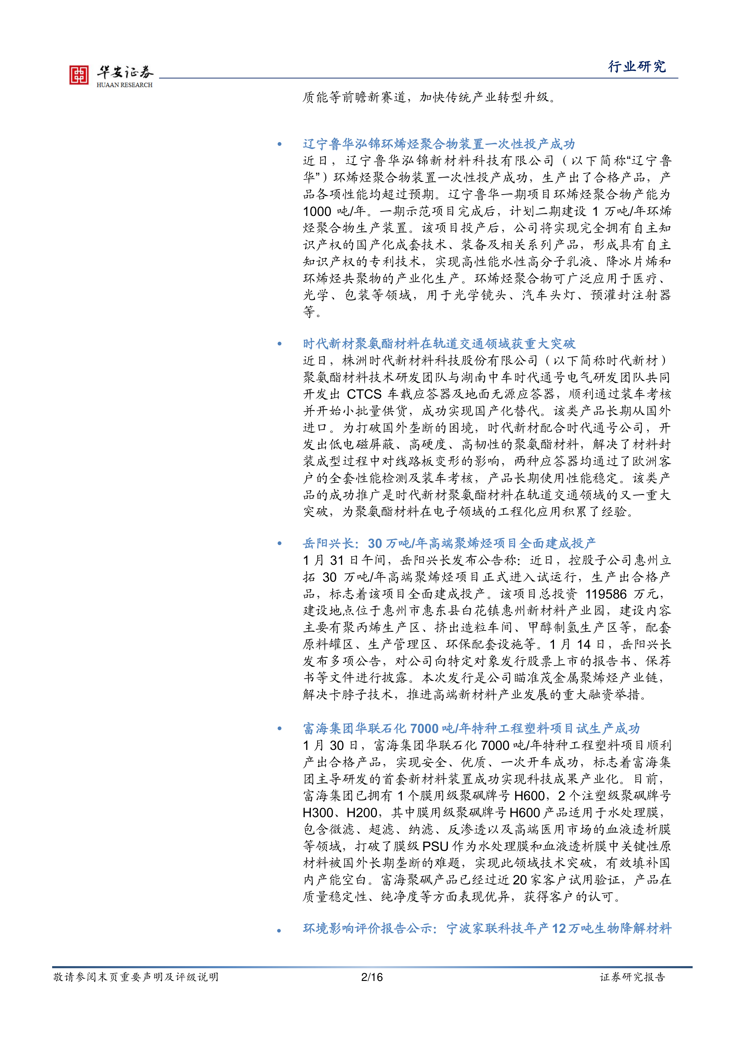 1月31日午间,岳阳兴长发布公告称:近日,控股子公司惠州立拓30万吨/年高端聚烯烃项目正式进入试运行,生产出合格产品,标志着该项目全面建成投产。该项目总投资119586万元,建设地点位于惠州市惠东县白花镇惠州新材料产业园,建设内容主要有聚丙烯生产区、挤出造粒车间、甲醇制氢生产区等,配套原料罐区、生产管理区、环保配套设施等。1月14日,岳阳兴长发布多项公告,对公司向特定对象发行股票上市的报告书、保荐书等文件进行披露。本次发行是公司瞄准茂金属聚烯烃产业链,解决卡脖子技术,推进高端新材料产业发展的重大融资举措。