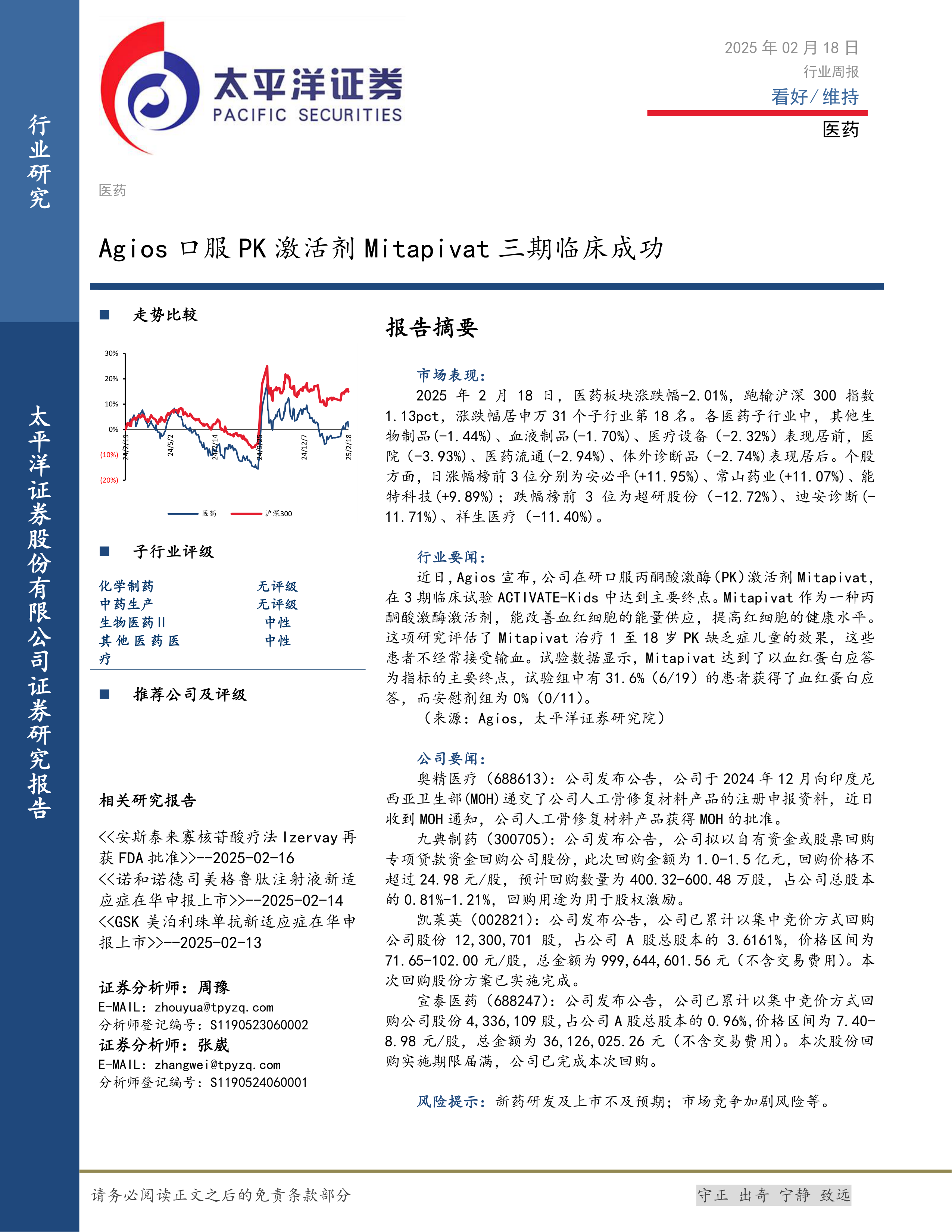 本报告的核心观点是:2025年2月18日,医药板块整体表现弱于大盘,但个股表现分化明显。Agios公司口服PK激活剂Mitapivat三期临床试验成功是医药行业的重要利好消息,值得关注。部分公司发布回购股份公告,显示出对公司未来发展的信心。
