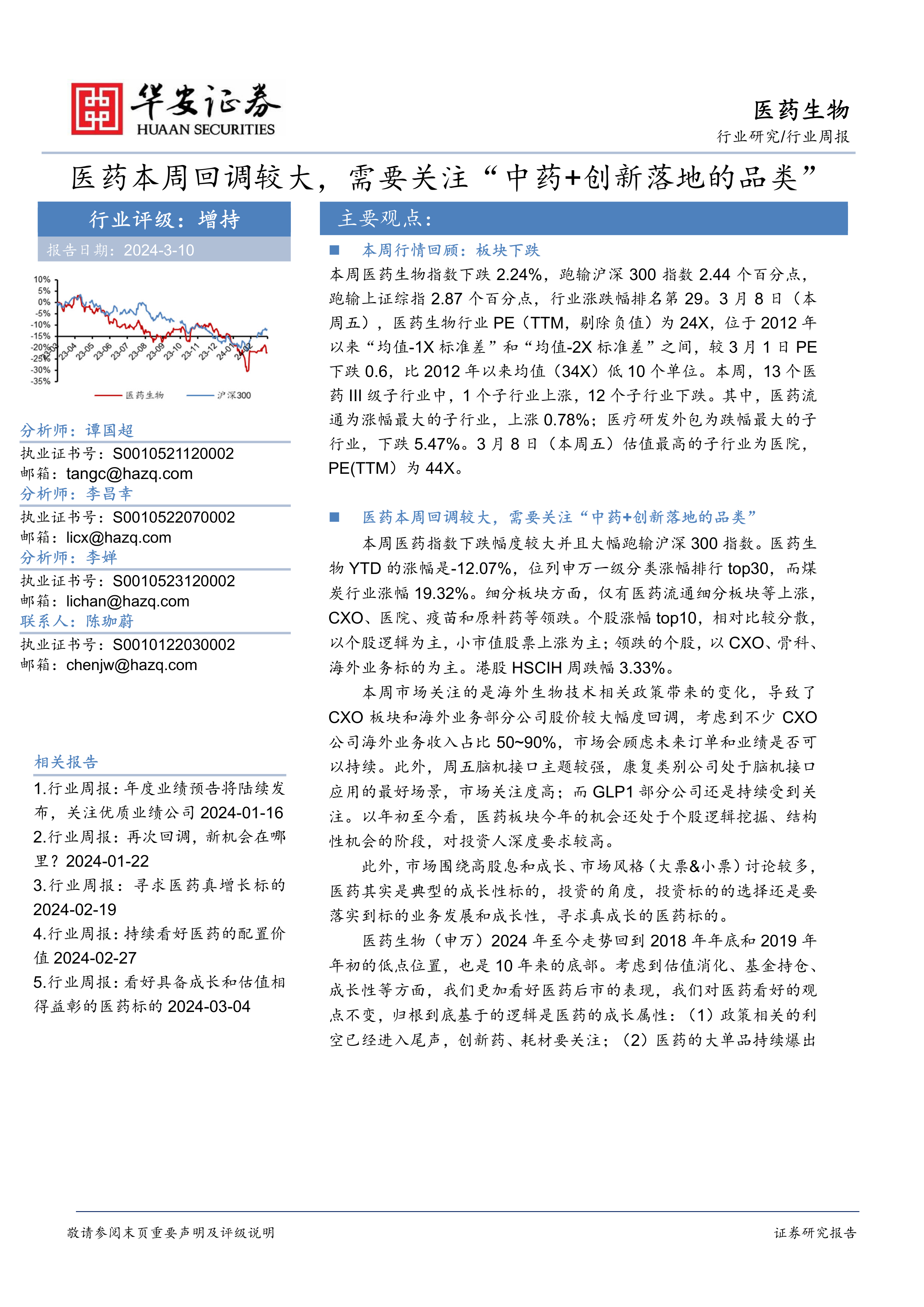 本周医药生物指数下跌2.24%,跑输主要市场指数。13个医药III级子行业中,仅医药流通子行业上涨,其余均下跌,医疗研发外包跌幅最大。截至3月8日,医药生物行业PE(TTM)为24X,低于2012年以来均值。报告通过图表详细展示了A股和港股医药板块的涨跌幅、估值以及个股表现。