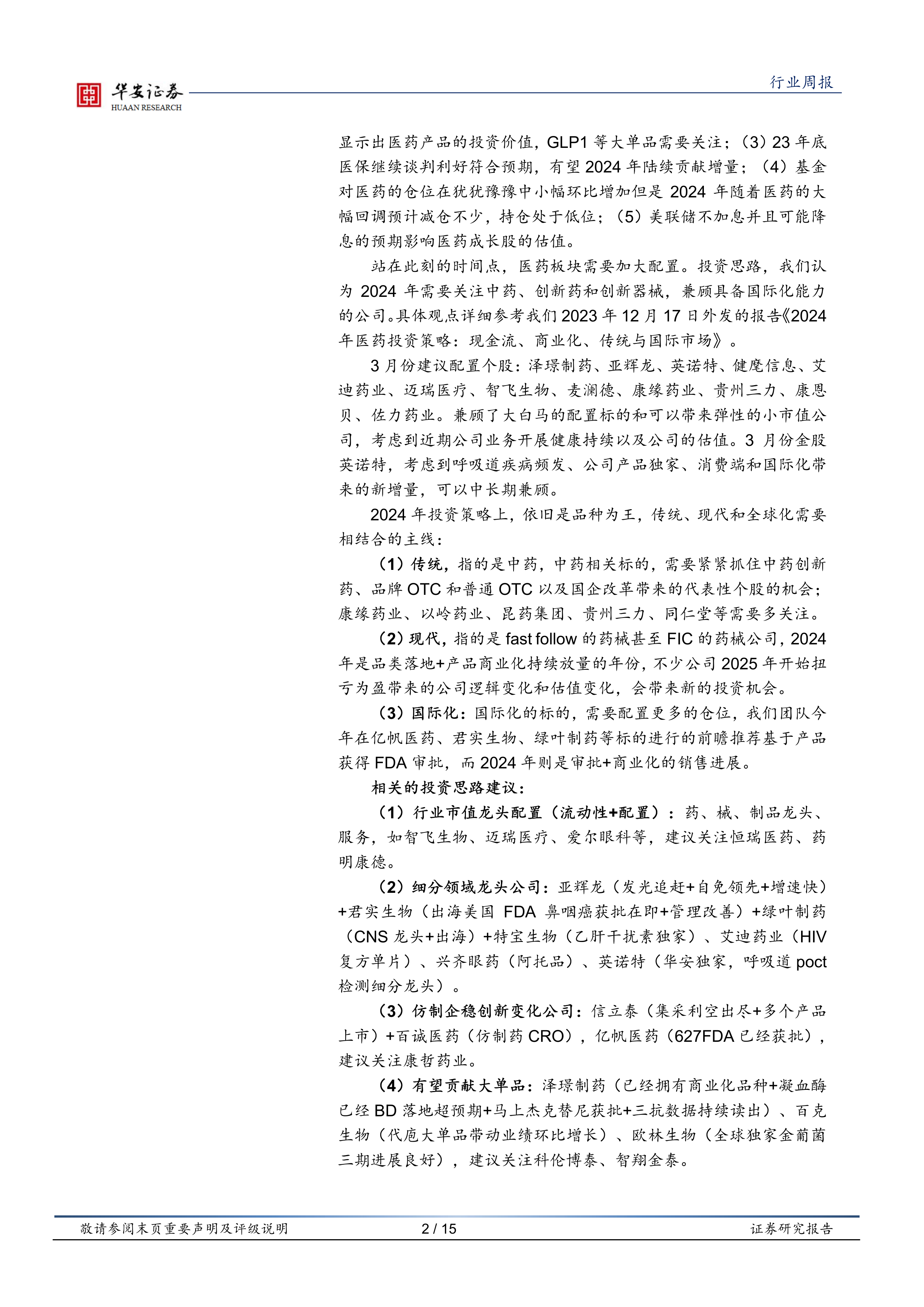 站在此刻的时间点,医药板块需要加大配置。投资思路,我们认为2024年需要关注中药、创新药和创新器械,兼顾具备国际化能力的公司。具体观点详细参考我们2023年12月17日外发的报告《2024年医药投资策略:现金流、商业化、传统与国际市场》。